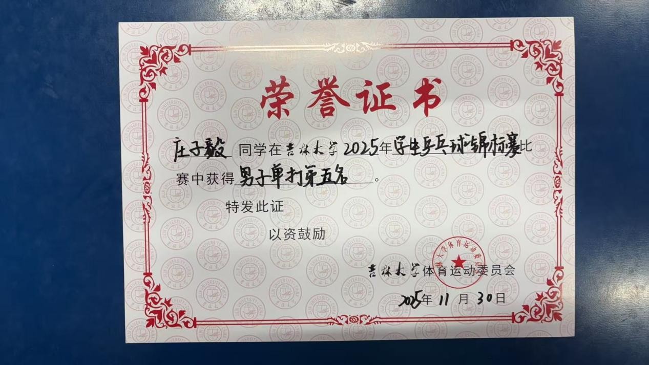 经过多轮角逐,赛事顺利结束。其中,庄子毅同学凭借出色发挥,荣获男子单打第五名,展现出良好的竞技水平。