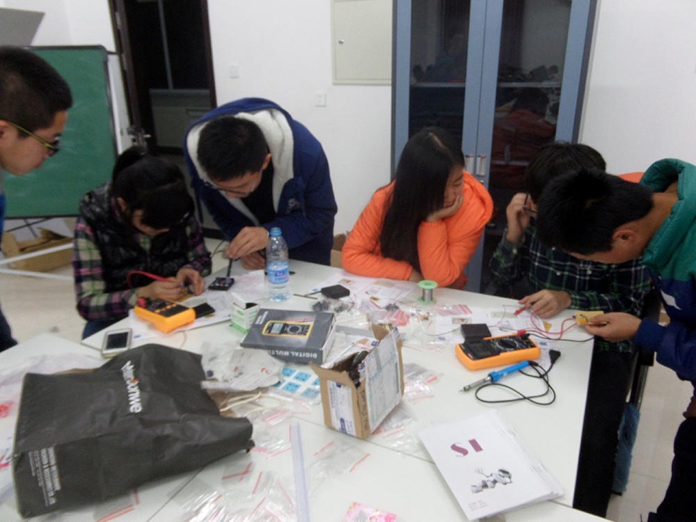 此次培训的主要内容是焊接红外感应出水器电路板,相比之前基础技能的训练,其操作难度有了明显的加强。首先,由科技协会原会长、2013级硕士研究生周鹤同学为大家演示已焊接好的红外感应出水器成品并详细讲解了其工作原理。他着重强调了此次电路焊接的重点难点以及操作过程中的注意事项,同学们都认真的听讲并做了详细笔记。之后,2012级会员为大家分发所需元器件并在一旁耐心指导。大家全神贯注、认真细致,积极讨论、虚心好学,协会骨干成员亲切指导,对在场同学的疑难困惑一一进行了解答。