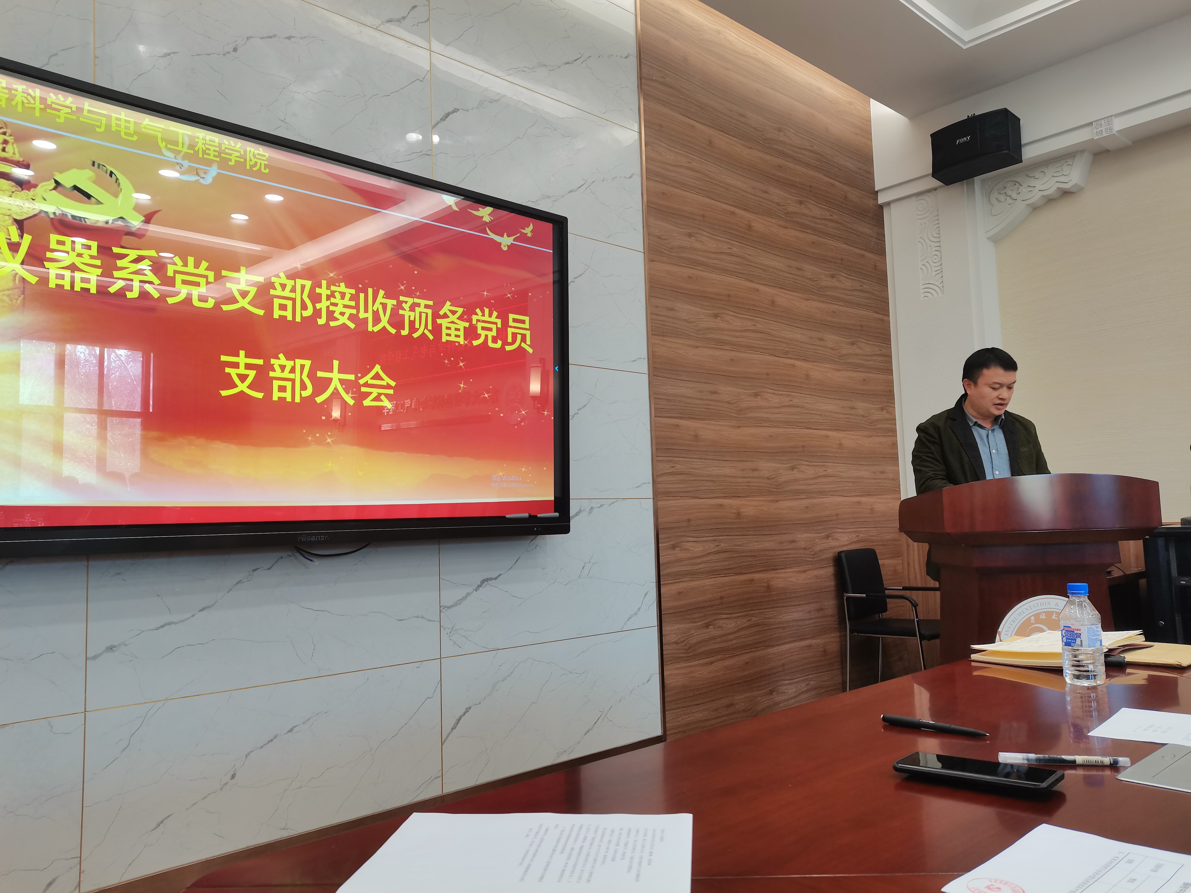 仪器系党支部在地质宫330召开支部党员大会,专题讨论关于接受张帆同志为预备党员的工作。党支部16名正式党员参会,会议由党支部书记陈晨同志主持,学院党委书记邱增凯同志参会。