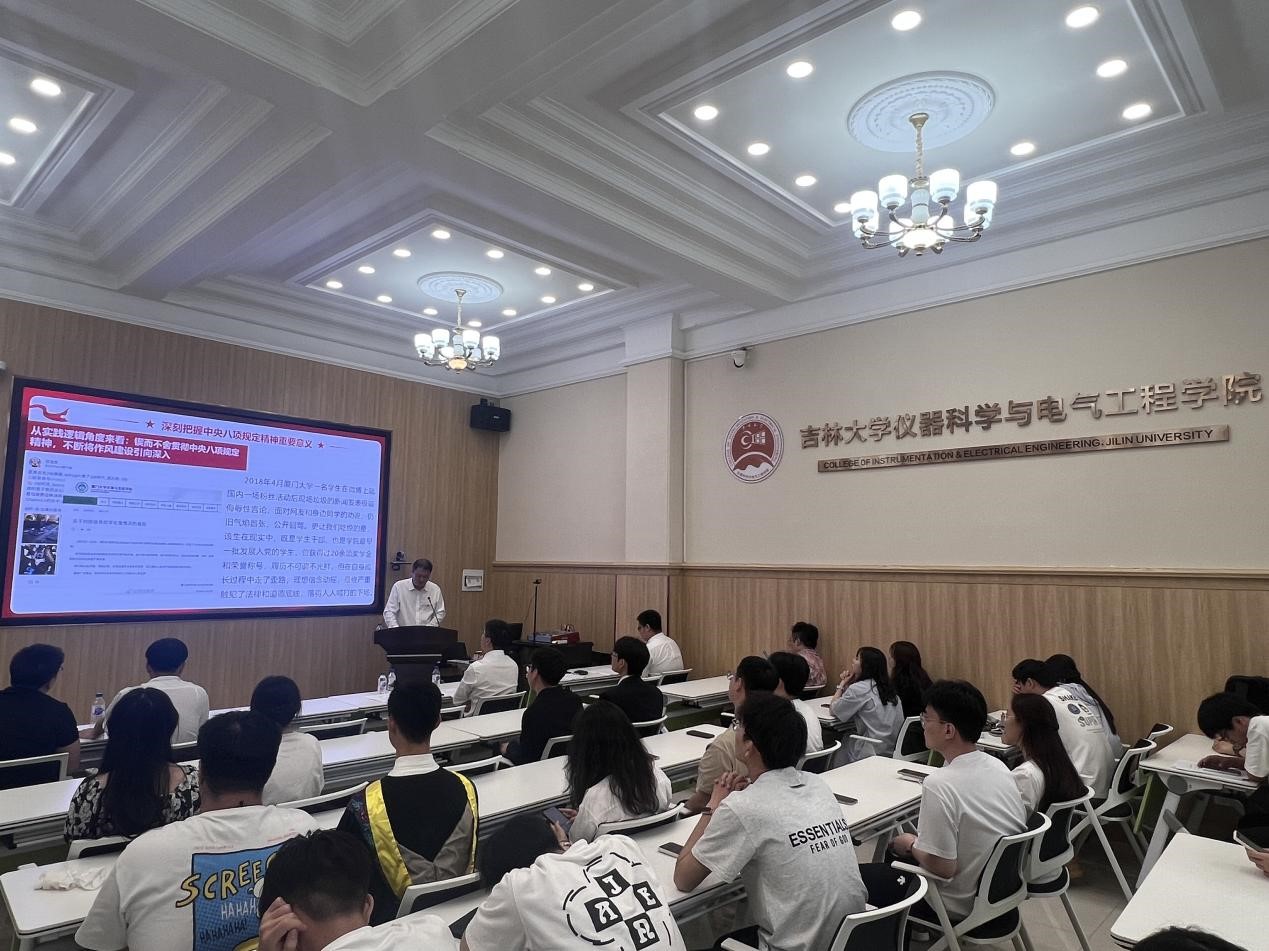 党课上,邱增凯首先向顺利完成学业的毕业生党员们表示热烈祝贺与诚挚祝福。他回顾了同学们在吉大求学度过的美好时光,表达了对毕业生党员们的殷切期盼。邱增凯从 “为什么学”“学什么”“怎么学”三个部分论述了开展深入贯彻中央八项规定精神学习教育的重要意义。在讲解 “为什么学”时,他从历史逻辑、理论逻辑和实践逻辑三个维度,详细解读了党的作风建设在全面从严治党中的关键作用,强调了“八项规定”已成为新时代中国共产党推进自身建设的“金色名片”。在“学什么”部分,他系统介绍了中央八项规定的主要内容、主旨要义以及现实表现,结合高校中的相关案例,深入剖析了“四风”问题的危害性,提醒毕业生党员要坚决抵制不良风气,维护学术道德、坚守学术诚信。在“怎么学”部分,邱增凯对毕业生党员提出了三点期望:一是坚定理想信念,筑牢政治忠诚,增强 “四个意识”、坚定 “四个自信”、做到 “两个维护”;二是怀抱进取之心,淬炼过硬的本领素养,坚持在“干中学、学中干”,勇于创新创造;三是严守纪律规矩,永葆清廉底色,自觉加强党性锤炼,以过硬作风践行初心使命。