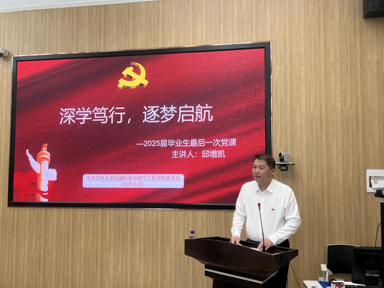 党委书记邱增凯为全院2025届毕业生党员讲授“深学笃行,逐梦启航”专题党课,为即将迈向人生新征程的毕业生党员们送上殷切期望和深情祝福。本次活动是学院党委为2025届毕业生离校前集中组织的“最后一次党课”,学院党委副书记兼副院长曲珩主持,学院全体2025届本科生党员、研究生党员参加活动。