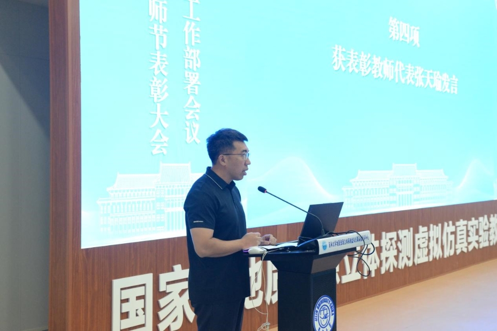 随后,电气系教师张天瑜代表获奖教职工发言。他介绍了在教学改革与创新中的实践与探索,分享了建设智能化课程体系、获得吉林省高校教师教学创新大赛一等奖的心得与体会,祝愿学院教育教学工作在未来发展中不断跨越、再创辉煌。