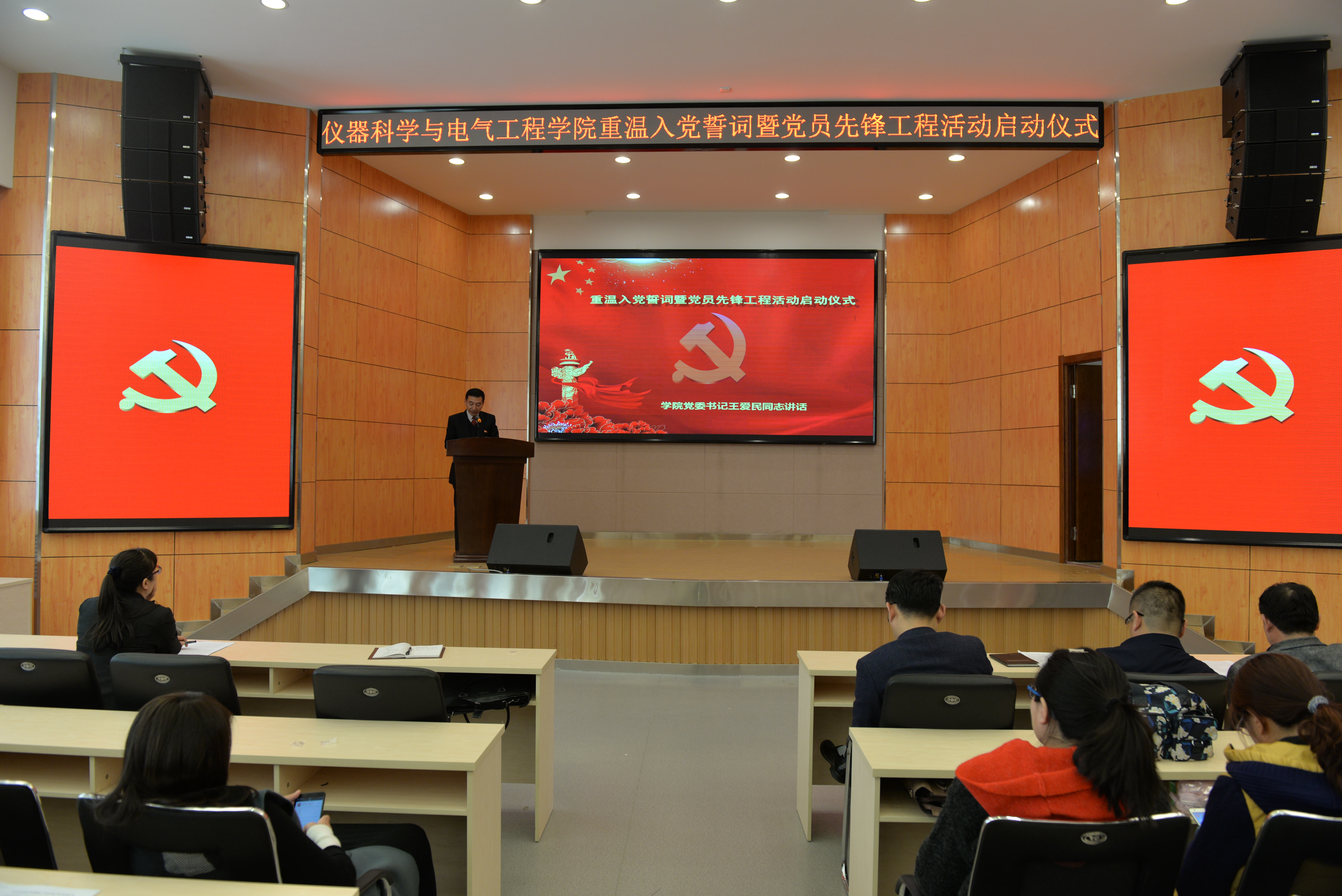 仪式在雄壮的《国际歌》中拉开序幕,全体党员在学院党委书记王爱民同志的领誓下面对党旗庄严宣誓,重温入党誓词,在激昂的宣誓声中重温入党誓词时刻的激动与庄严,激励广大党员要永葆党员先进性,用高标准严格要求自己,将以更加饱满的热情、更加敬业的态度、更加充足的干劲,更加踏实的作风,为仪电学院的发展再立新功。副院长葛晓野同志和院团委书记张昊宇同志分别宣读了《 onlytik