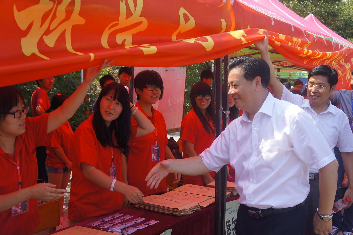 2014年8月30日上午,校长李元元院士、校党委副书记兼副校长韩晓峰教授、副校长张向东教授在学校相关职能部门负责领导陪同下来到中心校区五月花广场视察2014年迎新工作情况。
