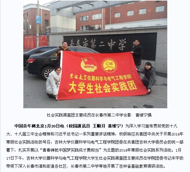 大学生寒假社会实践团在院团委书记朱宇带领下开展的吉林省基础教育调研活动受到了共青团中央主办的中央重点新闻网站——中国青年网的关注报道,中国青年网于1月20日以《吉大学子寒假开展吉林省基础教育调研》为题做了详细介绍。