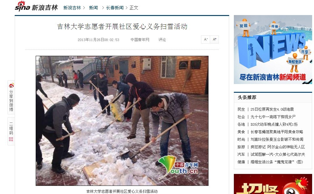 团委迅速行动,于2013年11月24日组织60余名大学生志愿者走进朝阳区清和街道南昌社区开展了爱心义务扫雪活动。活动受到了街道工作人员和社区居民的高度评价,在社会上引起良好反响。