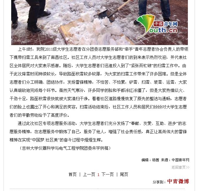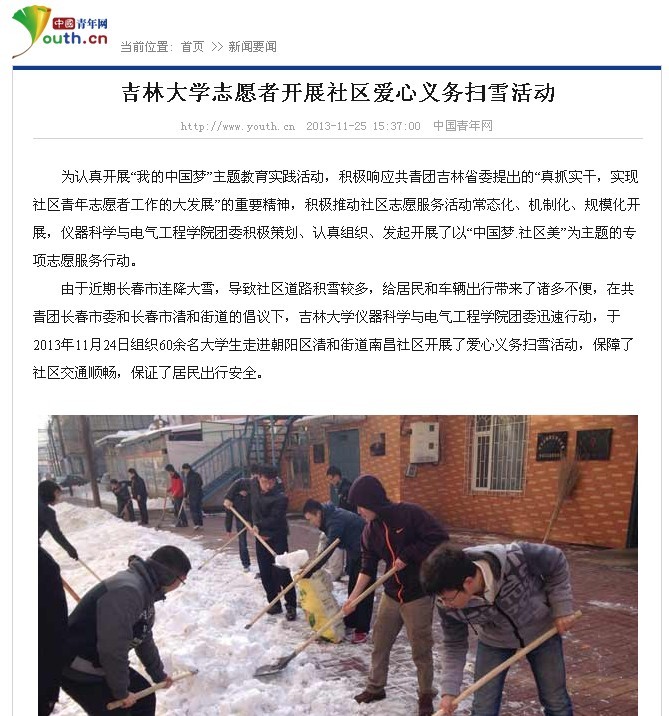 团委迅速行动,于2013年11月24日组织60余名大学生志愿者走进朝阳区清和街道南昌社区开展了爱心义务扫雪活动。