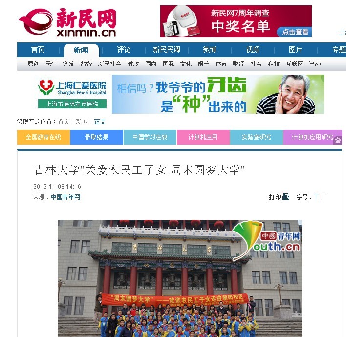 “关爱农民工子女 周末圆梦大学”》为题的详细报道后,在校内外产生了良好而广泛的影响,人民网、新民网、中华慈善新闻网等社会主流媒体和吉大新闻网等校内媒体对此进行了全文转载报道。