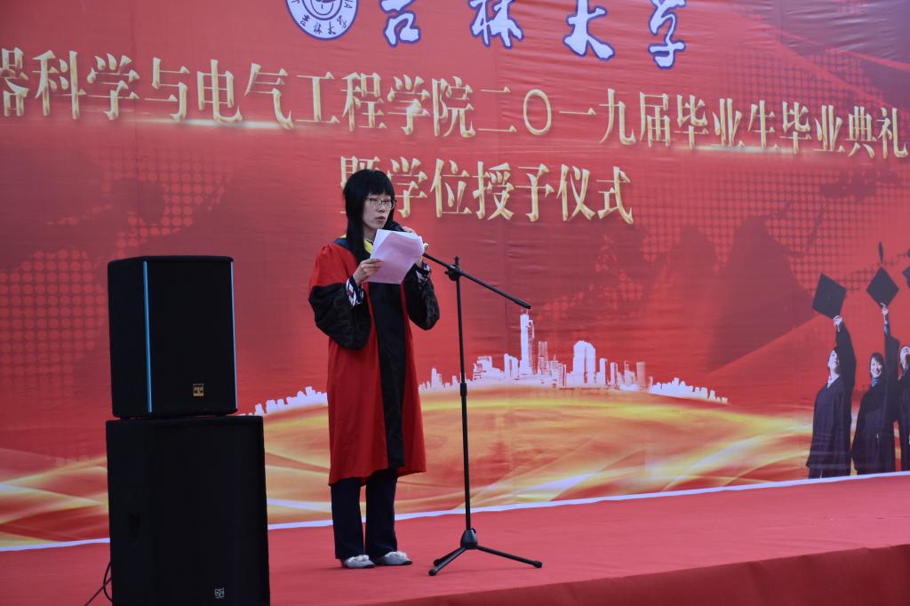 毕业典礼在雄壮的国歌声中拉开序幕。副院长林婷婷宣读了博士学位、硕士学位授予决定,副院长刘长胜宣读学士学位授予决定。院长嵇艳鞠教授、副院长林婷婷教授为毕业生授予学位。王爱民书记分别为校优秀毕业生和院2015级优秀班导师颁发了荣誉证书。研究生代表李庆运同学,本科生代表马松辰同学依次上台发言,深切表达了对学校、对老师的感激之情和对同学、朋友的不舍之情,以及即将踏入社会的坚定信心;学生家长李建梅女士代表全体家长向老师们表示了诚挚的谢意,也表达了对全体毕业生的美好祝愿;栾卉老师代表全体老师表达了对学生的关心与殷切期望。