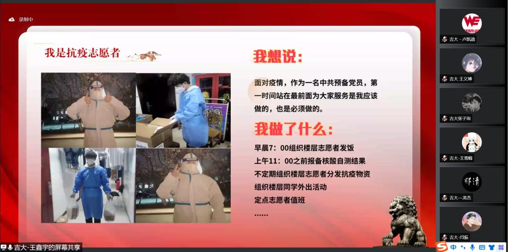 抗疫志愿者代表分享广大师生在抗疫过程中的先进事迹和宝贵经验。郝毅、王鑫宇、赵梦珂、胡玮桐同学分别从个人和集体两个角度出发,分享了在校园封闭管理期间的抗疫日记和志愿服务经历,吉大学子守望相助、封校不停学,学生党员积极投身防疫一线,践行着新时代青年的初心与使命。听完 onlytik