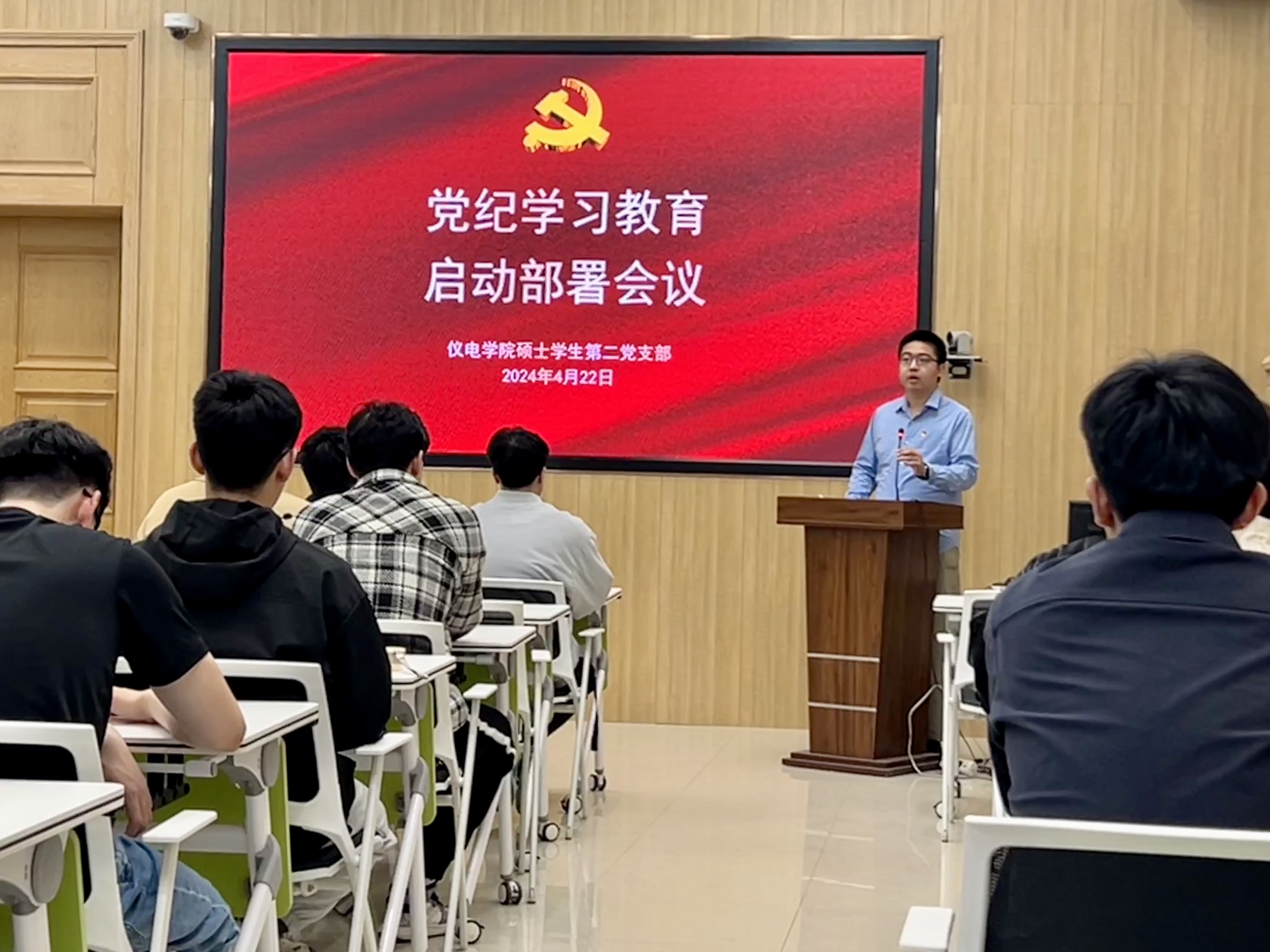 为深入学习贯彻习近平总书记关于党纪学习教育的指示批示精神,深入学习贯彻《中国共产党纪律处分条例》,按照学校、学院党委部署安排,仪电学院硕士学生第二党支部于4月22日晚上在朝阳校区地质宫208会议室召开了党纪学习教育启动部署会议,对本支部的党纪学习工作进行启动部署。党支部全体党员、积极分子参加会议,会议由党支部书记周琪老师主持。