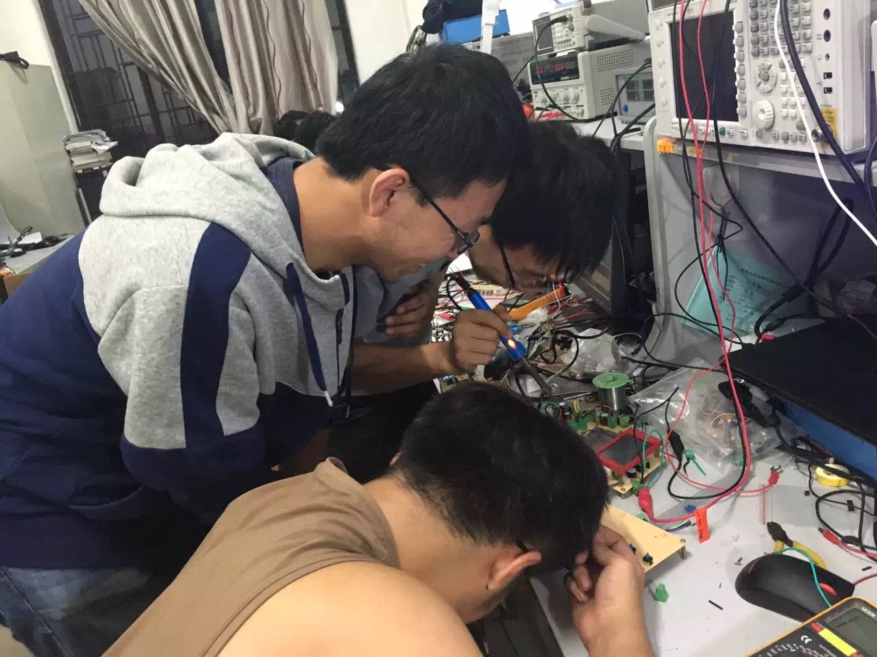 为了能圆满的完成三下乡活动之专业社会实践活动的各项任务,在为期65天的赛前培训期间,同学们充分发挥了仪电学院刻苦拼搏的精神,秉承实验室多年来精益求精的理想,始终奋斗在实验室。当中,大一新生杨洋的努力格外引人注目。作为卓越工程师班的学生,不仅追求学业成绩优秀,而且励志在实践方面也同样做到巾帼不让须眉。由于平时缺乏实践方面的培训,面对困难的她并没有气馁,反而增加了自己在实验室的时间,她用比别人多花的时间将实践方面的缺陷慢慢地补了回来。“人十能之,己百之”,正是凭借着这种精神,杨洋同学交出了一份令人满意的答卷。14级控制组为了能顺利的控制好乒乓球的悬浮,不仅自学3D打印机的使用,而且学会了利用刻板机刻制电路板,他们在目标的驱动下、老师和学长的帮助下不断地进步、不断地充实自己。此外,作为主力的13级学生也有条不紊地进行工作,不少学生为了能挤出更多的时间不惜在实验室打地铺睡觉。期间,为了检测大家在培训期间的成果,千承辉老师举行并主持了中期检查,所有学生的作品都受到了严格的审查和仔细的点评,检查过程中同学们相互交流,氛围良好。