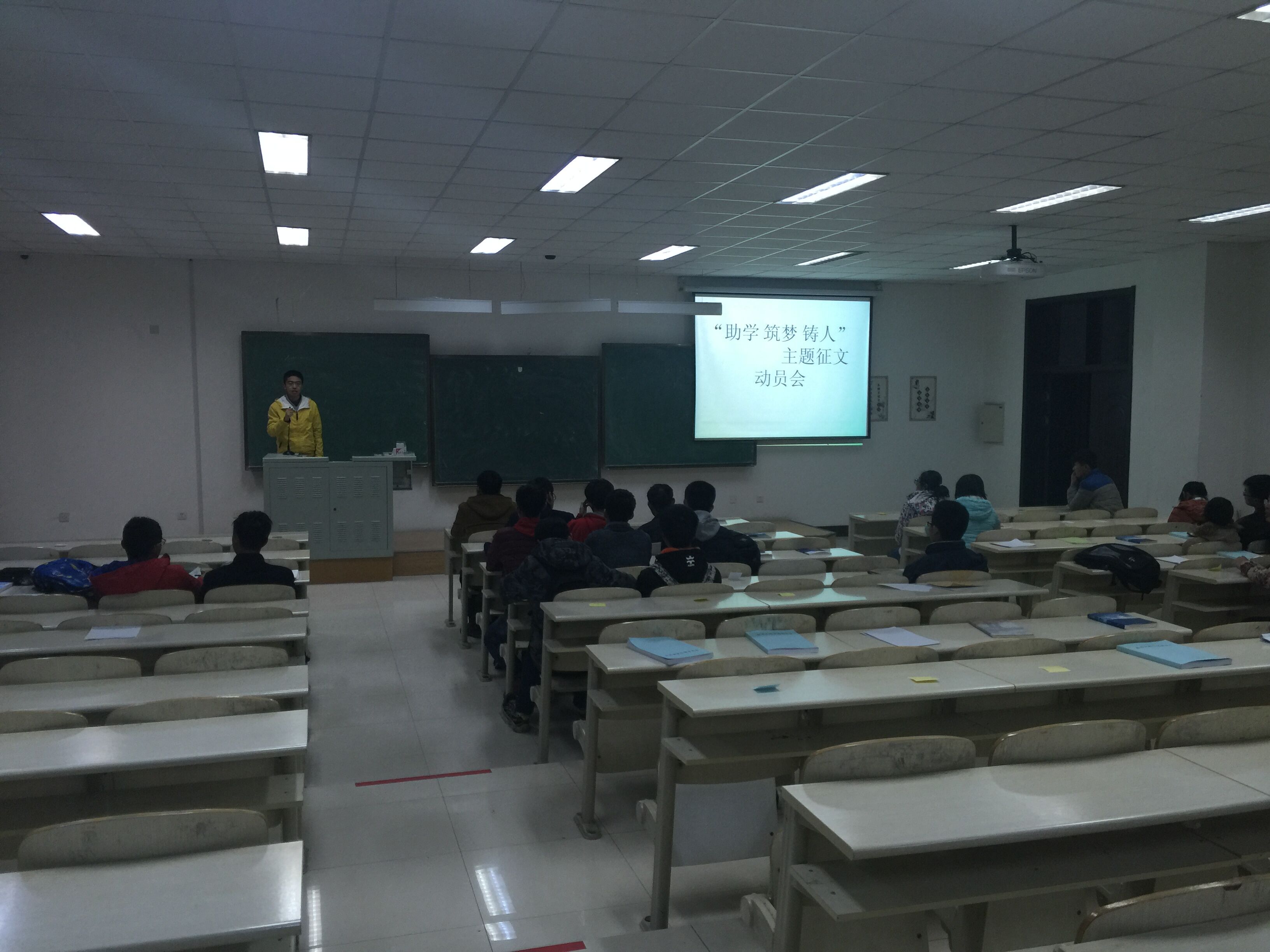于中心校区李四光教学楼302教室举行“助学•筑梦•铸人”主题征文系列活动动员会。会议由学生会资助管理部兼文艺部部长周琪主持。