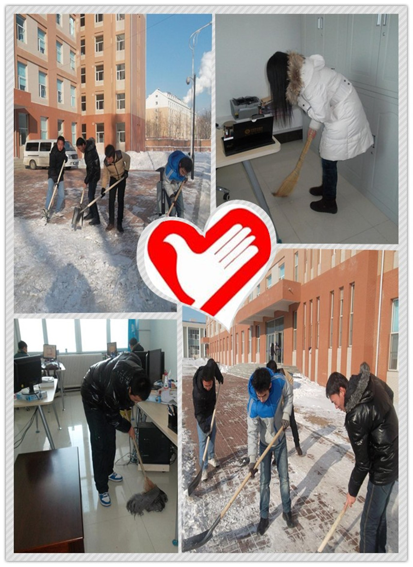 本次活动内容为:两部门2011级全体副部为中心校区基础园区一公寓和李四光教学楼门前清扫积雪和志愿者服务部2012级夏争辉、宁红扬两位志愿者同学为2012级新生辅导员打扫办公室两部分。12月5日13:30,社会实践部和志愿者服务部2011级全体副部长分别在李四光楼和基础园区一公寓门前集合,大家领取完扫雪工具后便立即开始了积雪清扫工作。由于条件的限制,学校配备的除雪工具仅仅是几把铁锹,加上五六级的寒风和零下二十度的寒冷气温,使除雪工作更加艰难。一开始,志愿者们脸和手脚都冻得通红,嘴里呼出的热气一下子就凝成了水雾,可是大家仍发扬吃苦耐劳、顽强拼搏的精神,团结协作,顶着寒风,咬牙坚持,将宿舍楼和教学楼外的积雪清扫干净。他们热火朝天、干劲十足的扫雪身影也感染了路过的同学,大家纷纷表示赞许。经过一个小时的奋战,此次扫雪任务圆满完成,虽然室外气温很低,但是大家劳动的热情,团结的力量让这个冬日变得格外灿烂和温暖。与此同时,志愿服务部2012级两名同学准时来到李四光楼203辅导员办公室,帮助新生辅导员蔡印老师打扫办公室。他们两位合理分工,埋头苦干,拿起抹布、笤帚等清洁工具对办公室的门窗、地面、桌椅、墙角等卫生死角进行了全面彻底的打扫和清理,活动过程中,他们不怕苦、不怕累,经过一个小时的劳动,顺利完成了大扫除任务,使办公室整洁卫生、焕然一新,两位同学的辛勤劳动也获得了大一导员蔡印老师的高度认可和鼓励。
