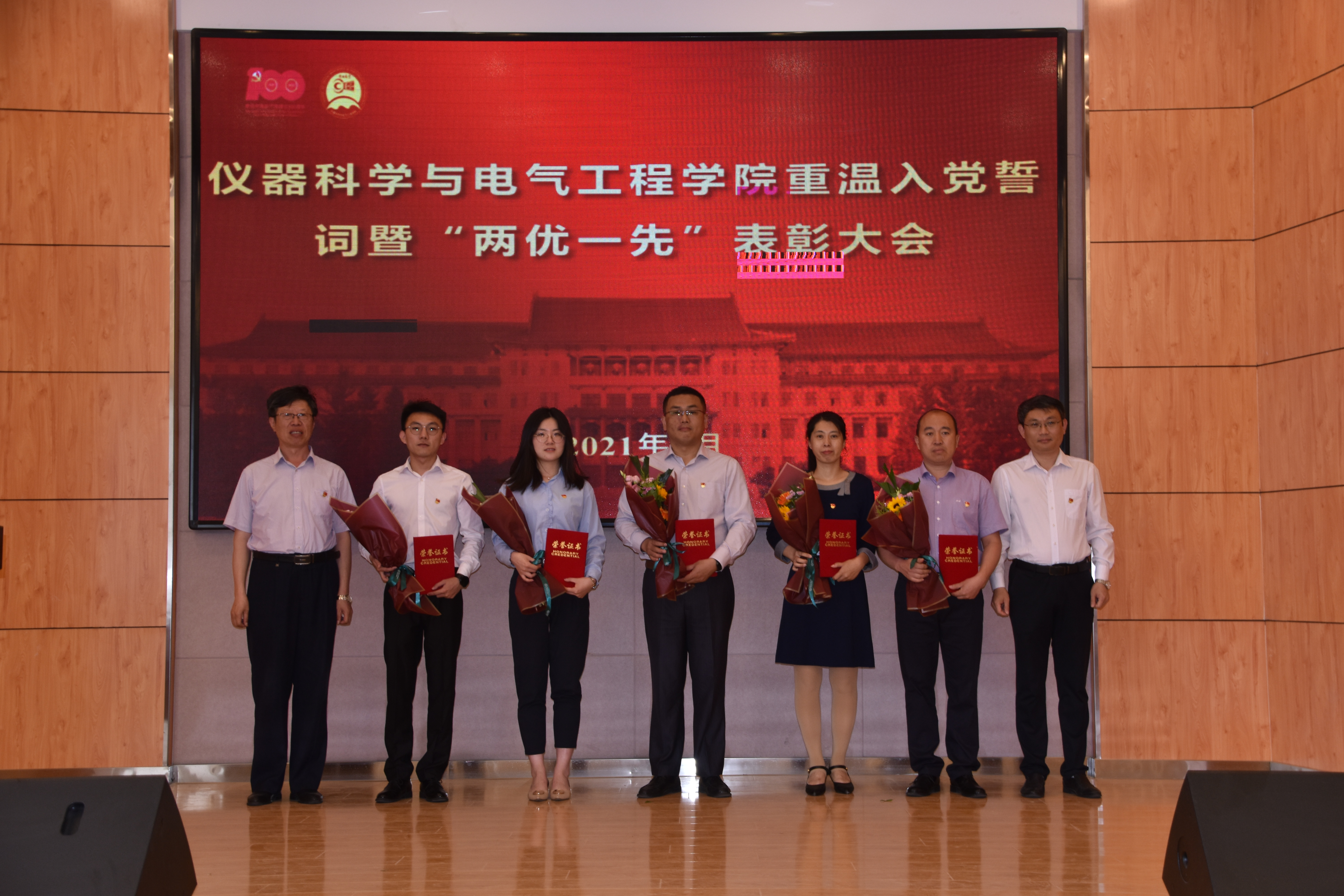 与电气工程学院党委书记邱增凯与党委委员陈祖斌为获得“优秀党务工作者”荣誉称号的6名突出个人颁发证书及鲜花; onlytik