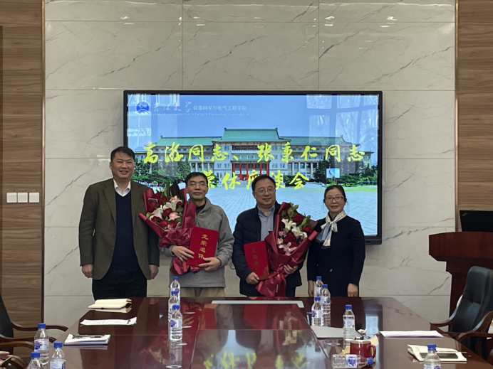 为高游老师和张秉仁老师举办了荣休座谈会。学院院长嵇艳鞠、党委书记邱增凯、副院长刘长胜和部分电气系教师参加了座谈会。座谈会由学院电气系副主任周志坚主持。