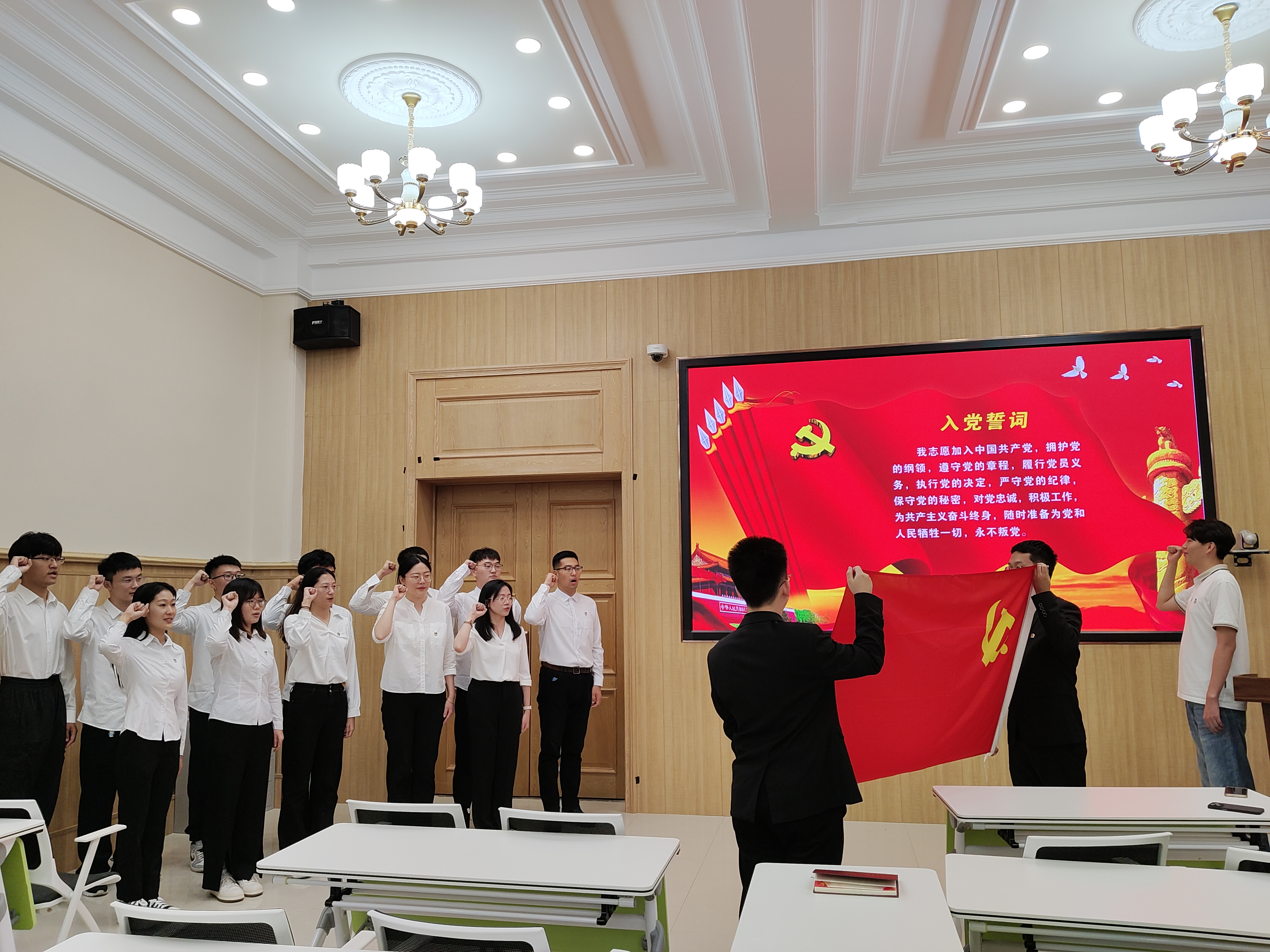 硕士学生第一党支部在地质宫208多功能厅举行了新发展党员入党宣誓仪式。党支部全体正式党员及12名新发展党员参加了此次仪式。仪式由党支部书记刘颜达同志主持。