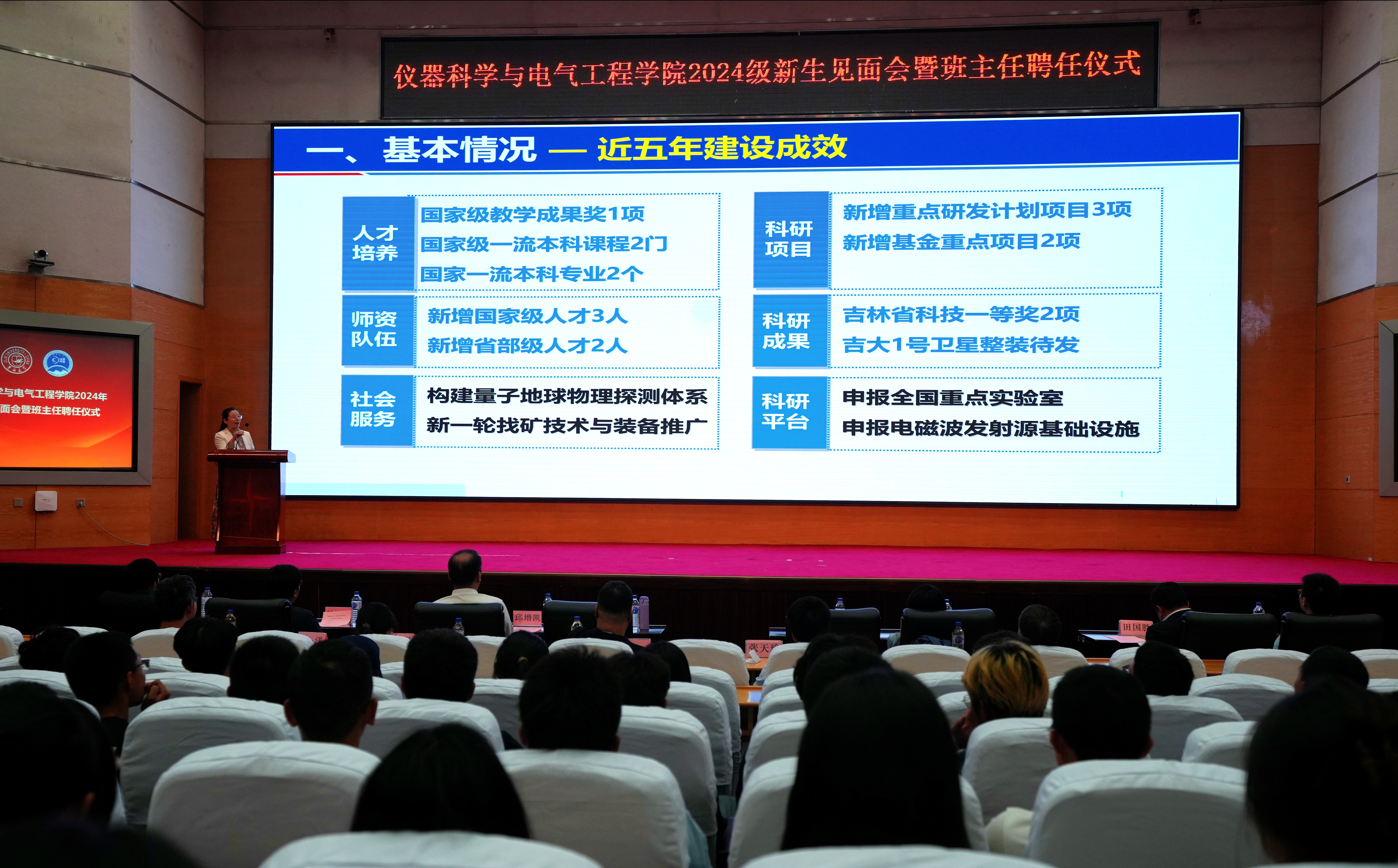 会议在雄壮的中华人民共和国国歌声中拉开了帷幕。首先进行的是班主任聘任仪式,由副院长刘长胜宣读聘任决定,学院党委书记邱增凯为班主任颁发聘书并合影留念。随后新生代表王晨皓进行发言,他讲述了对大学生活的期盼,和对吉大校训、仪电精神的初见解,字里行间体现了他及新同学们对未来四年的憧憬与向往,并表示他们要以饱满的热情、昂扬的斗志与坚定的信念,来面对未来的求学之路。班主任代表张天瑜老师也对新同学们表达了期许,分享了自己从教以来的教学经验及学术成果,并勉励24级新同学要怀揣一丝不苟,精益求精的学习品质在科学的海洋中探索,同时向新同学讲述在大学里应如何学习与生活,并表达了对新生们的美好祝愿。