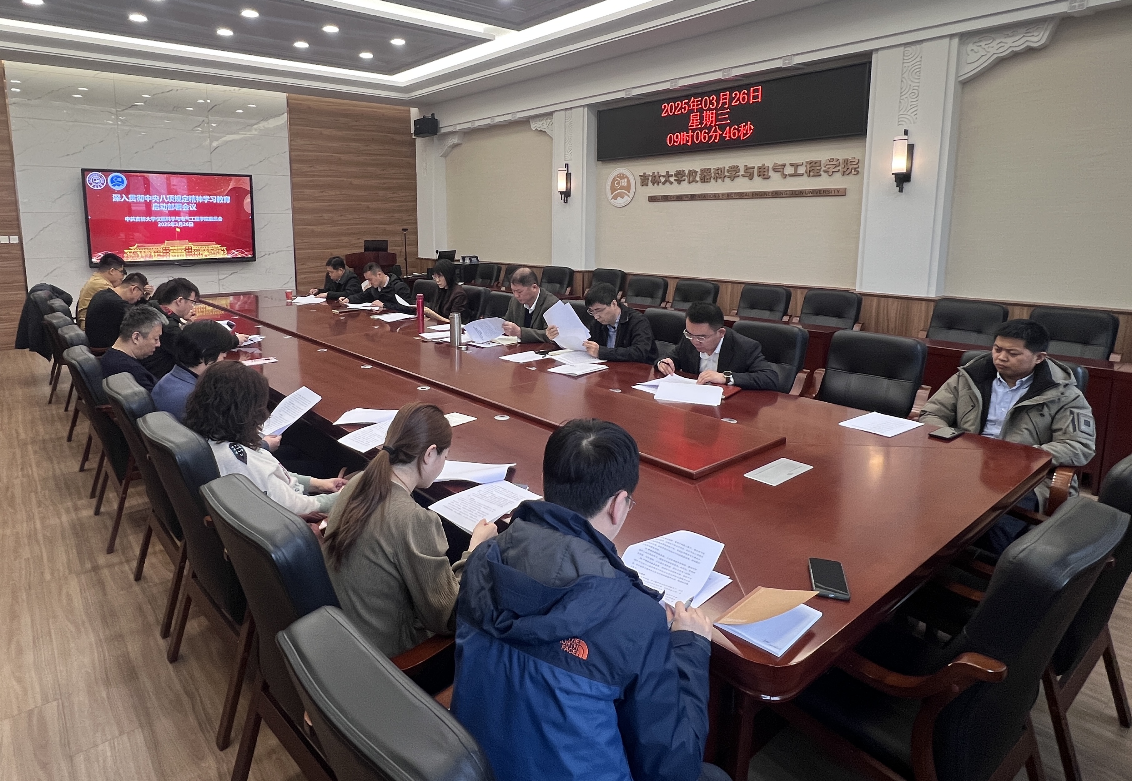 在朝阳校区地质宫召开深入贯彻中央八项规定精神学习教育启动部署会,学习贯彻习近平总书记关于深入贯彻中央八项规定精神学习教育的重要讲话和重要指示精神,传达学校深入贯彻中央八项规定精神学习教育启动部署会会议精神,部署学院学习教育工作。会议由学院党委书记邱增凯主持,学院全体领导班子成员、党委委员、纪委委员、党支部书记、科室负责人参加会议。