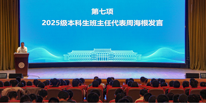电气系教师周海根代表2025级本科生班主任发言,寄语同学们要尽快适应大学节奏,努力培养严谨务实的学术态度和精益求精的工匠精神,做到“学业与人格共进、知识与视野齐飞”。
