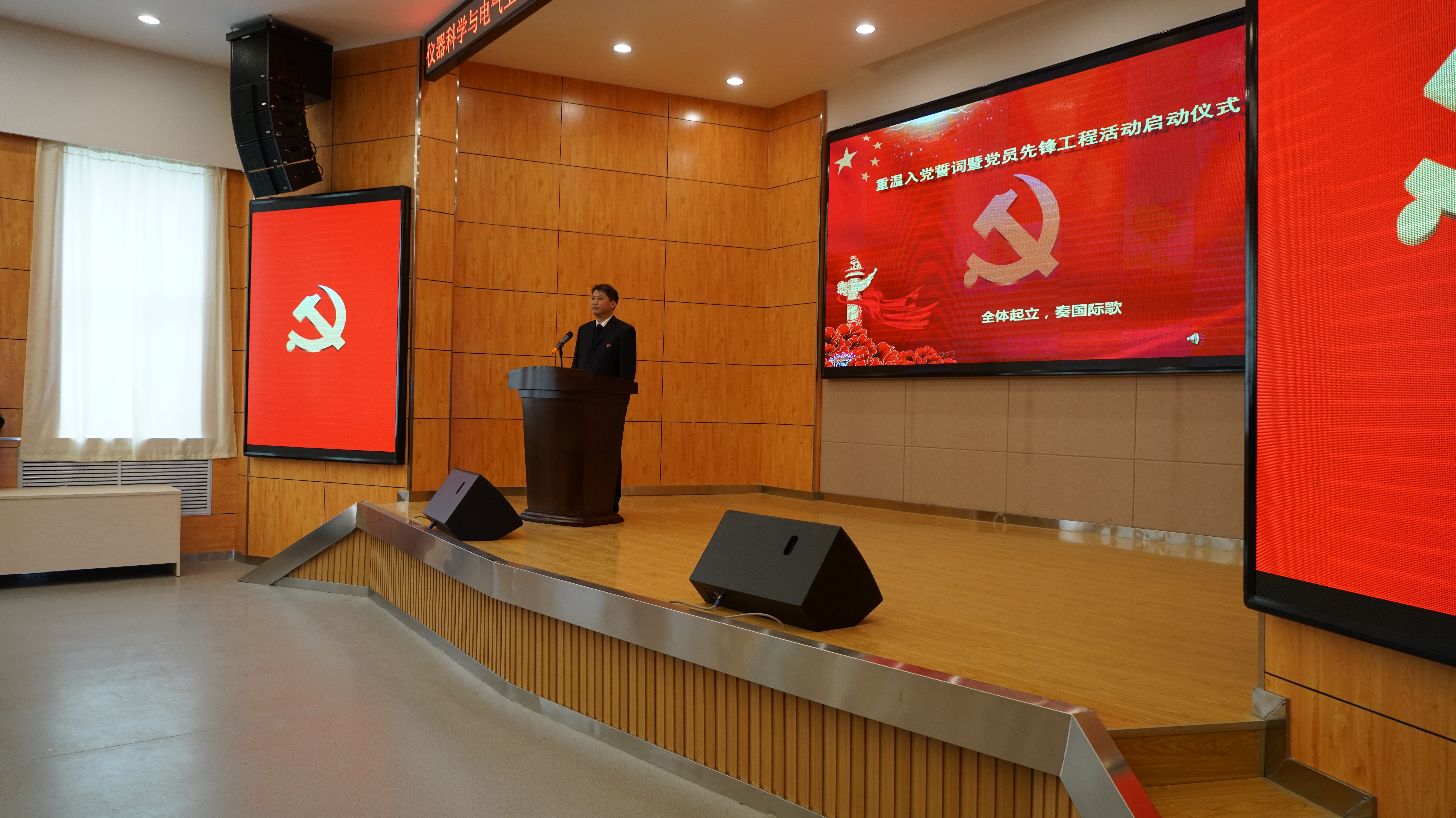 仪式在雄壮的《国际歌》中拉开序幕,全体党员在学院党委书记王爱民同志的领誓下面对党旗庄严宣誓,重温入党誓词,在激昂的宣誓声中重温入党誓词时刻的激动与庄严,激励广大党员要永葆党员先进性,用高标准严格要求自己,将以更加饱满的热情、更加敬业的态度、更加充足的干劲,更加踏实的作风,为仪电学院的发展再立新功。副院长葛晓野同志和院团委书记张昊宇同志分别宣读了《 onlytik