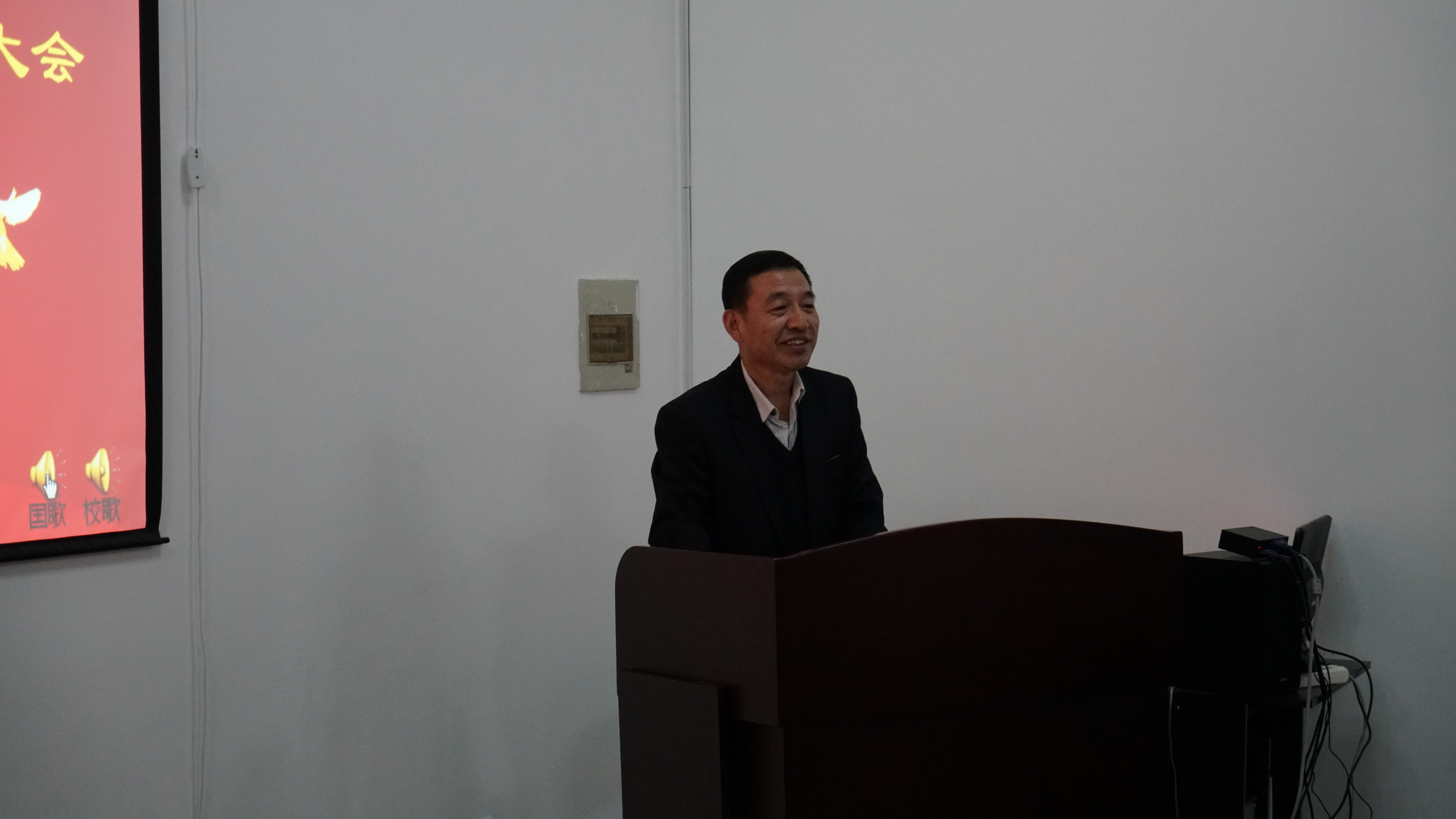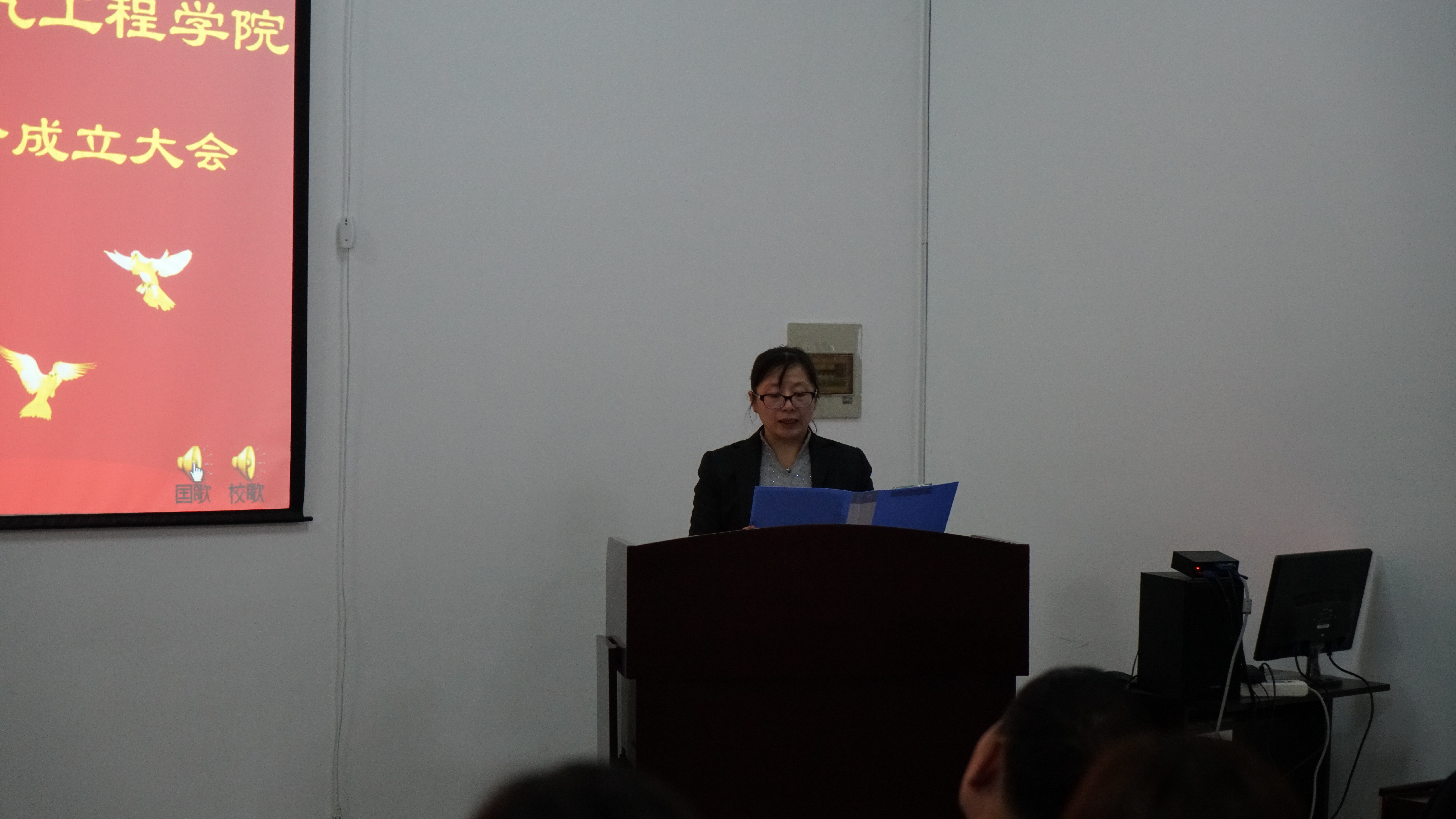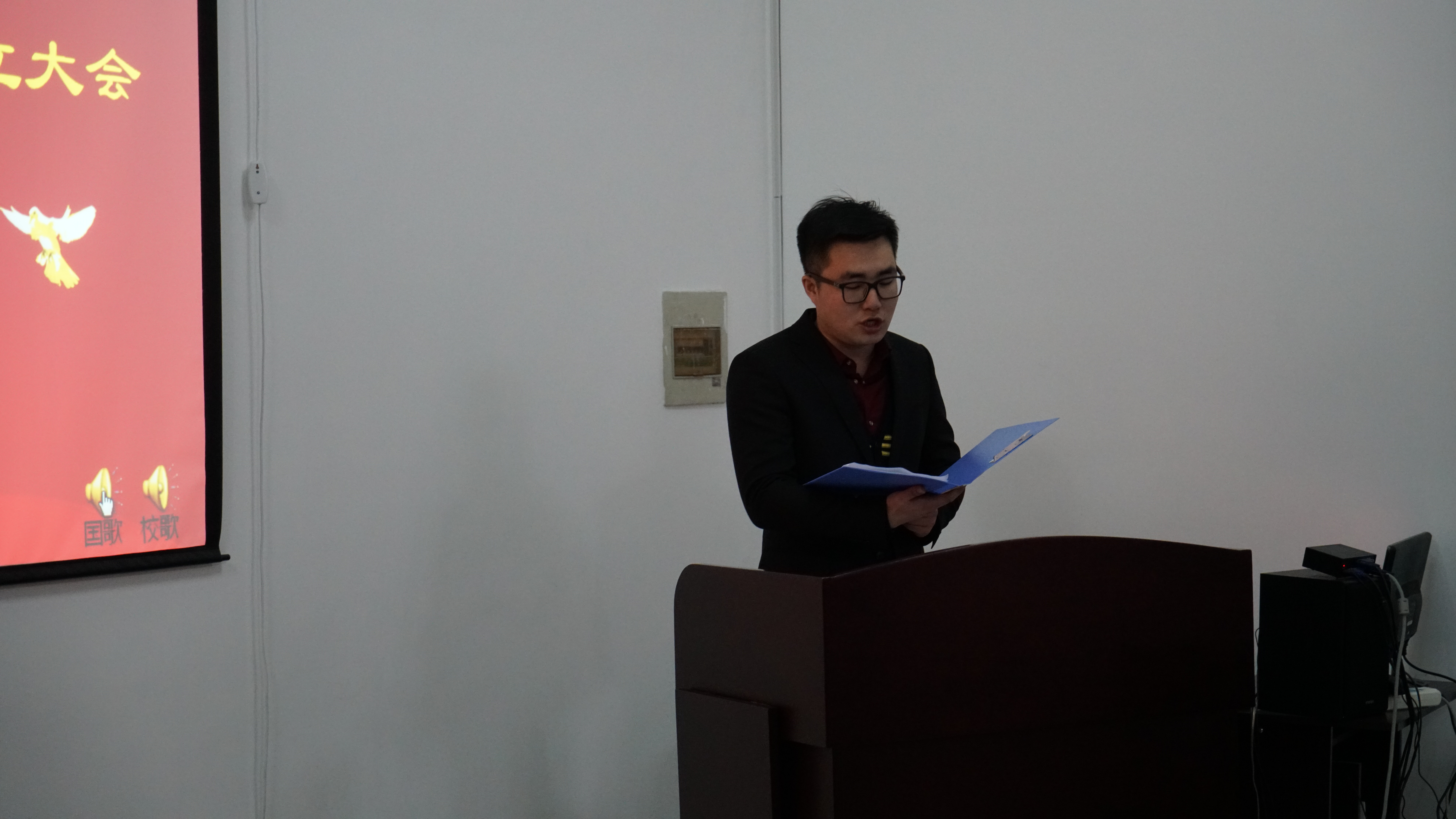 学院党委书记王爱民、副院长嵇艳鞠、党委副书记邱增凯和院团委书记张昊宇出席成立大会。下午1:30分,伴随着雄壮激昂的国歌声,会议在院党委副书记邱增凯老师的主持下拉开序幕。