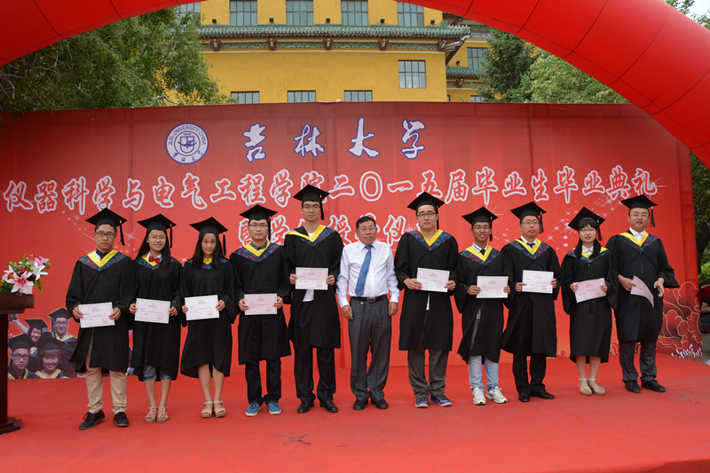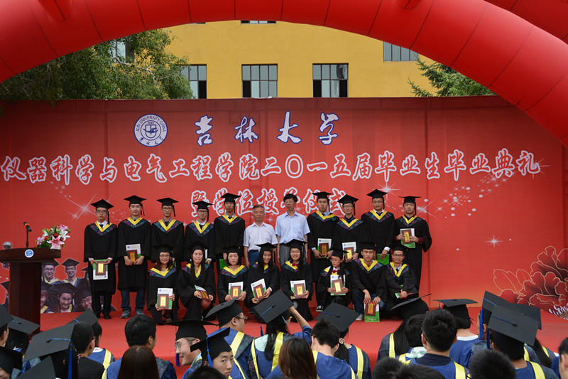 2015届研究生毕业生和本科毕业生名单,院长林君教授与院学科学位委员会副主席嵇艳鞠教授一起为2015届毕业生授予学位。随后,院党委书记余国友教授宣读了2015届校优秀毕业生名单,并为优秀毕业生颁发获奖证书、合影留念。学院教学委员会主任王应吉教授宣读了优秀毕业论文名单,仪器系主任凌振宝教授、电气系主任刘长胜副教授分别为获得优秀毕业论文的同学颁发证书并合影留念。之后,教师代表王应吉教授和2015届毕业生代表、 onlytik