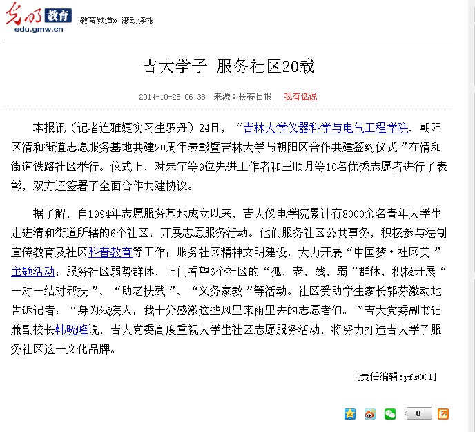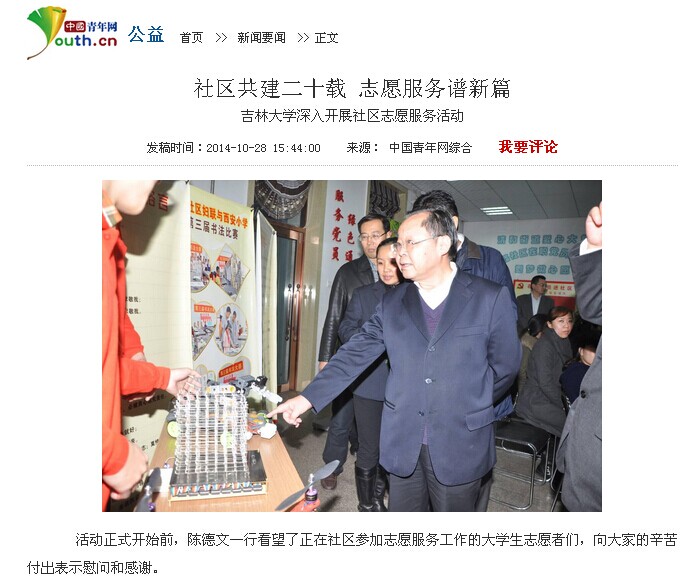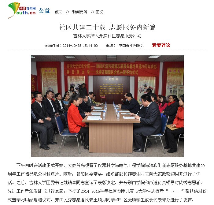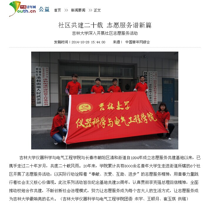 团委组织开展了以“风雨同舟二十载、志愿服务谱新篇”为主题的系列志愿服务活动,活动在校内外产生良好而广泛的影响。10月28日,光明网、长春日报以《吉大学子 服务社区20载》报道 onlytik
