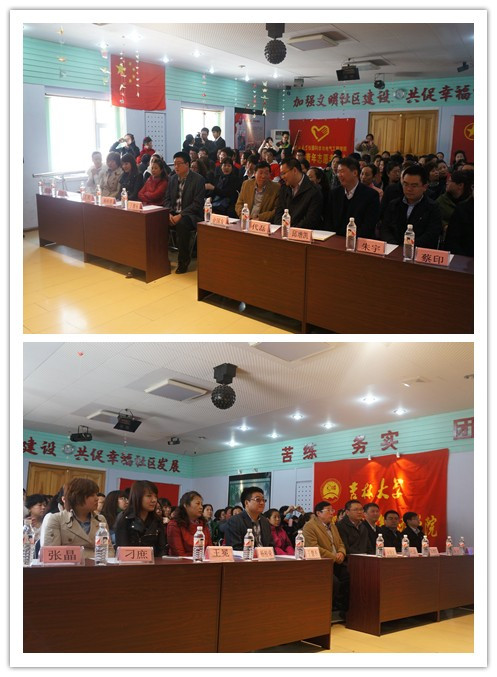 的大学生志愿者和社区居民们为大家献上了精彩的文艺节目。在同学们的表演中,不仅有歌曲《我的中国心》、乐器串烧、红歌合唱《我的祖国》《南泥湾》等对中华民族峥嵘岁月的高歌唱诵,还有京剧名段《光辉照儿永向前》、诗朗诵《中国梦》对万代中华魂的敬仰赞扬。在古典舞《羽扇丹青》中,由社区居民代表和青年学生共同放笔挥毫,为活动献上书法贺词。此外,活动还特别安排了来自四川的同学进行诗朗诵《祝福雅安》、歌曲《生死不离》,以此对雅安地震灾区的人们献上青年大学生的一份祈福。活动在雄壮的中国共产主义青年团团歌《光荣啊,中国共青团》的合唱声中圆满结束,会后各位领导嘉宾与演出人员进行了合影留念。