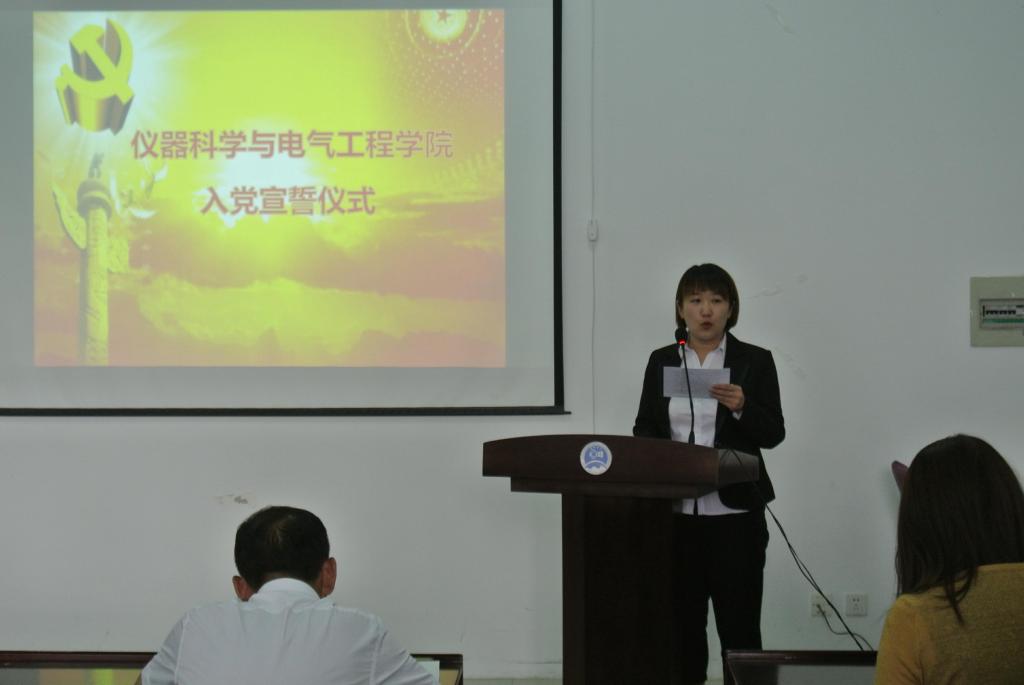 党委办公室主任刁庶带领全体党员面向党旗庄严宣誓。之后,研究生党支部新党员代表梁冰琪同学、入党积极分子代表周路佳同学分别做了发言。最后,院党委书记王爱民同志代表院党委做了深刻、精彩的讲话。王书记向全体学生党员提出了明确的要求,一是加强学习,不断提高理论水平和认知能力;二是积极工作,争取早日成为一名合格正式党员;三是知行统一、脚踏实地的做人做事。他希望同学们时刻严格要求自己,爱岗敬业,奉献进取,做一名组织放心、群众信赖的合格共产党员,以良好的精神状态,饱满的政治热情,以开拓进取、踏实敬业的工作作风,为实现中华民族获得伟大复兴中国梦贡献自己的一份力量,成为名副其实的共产党员。