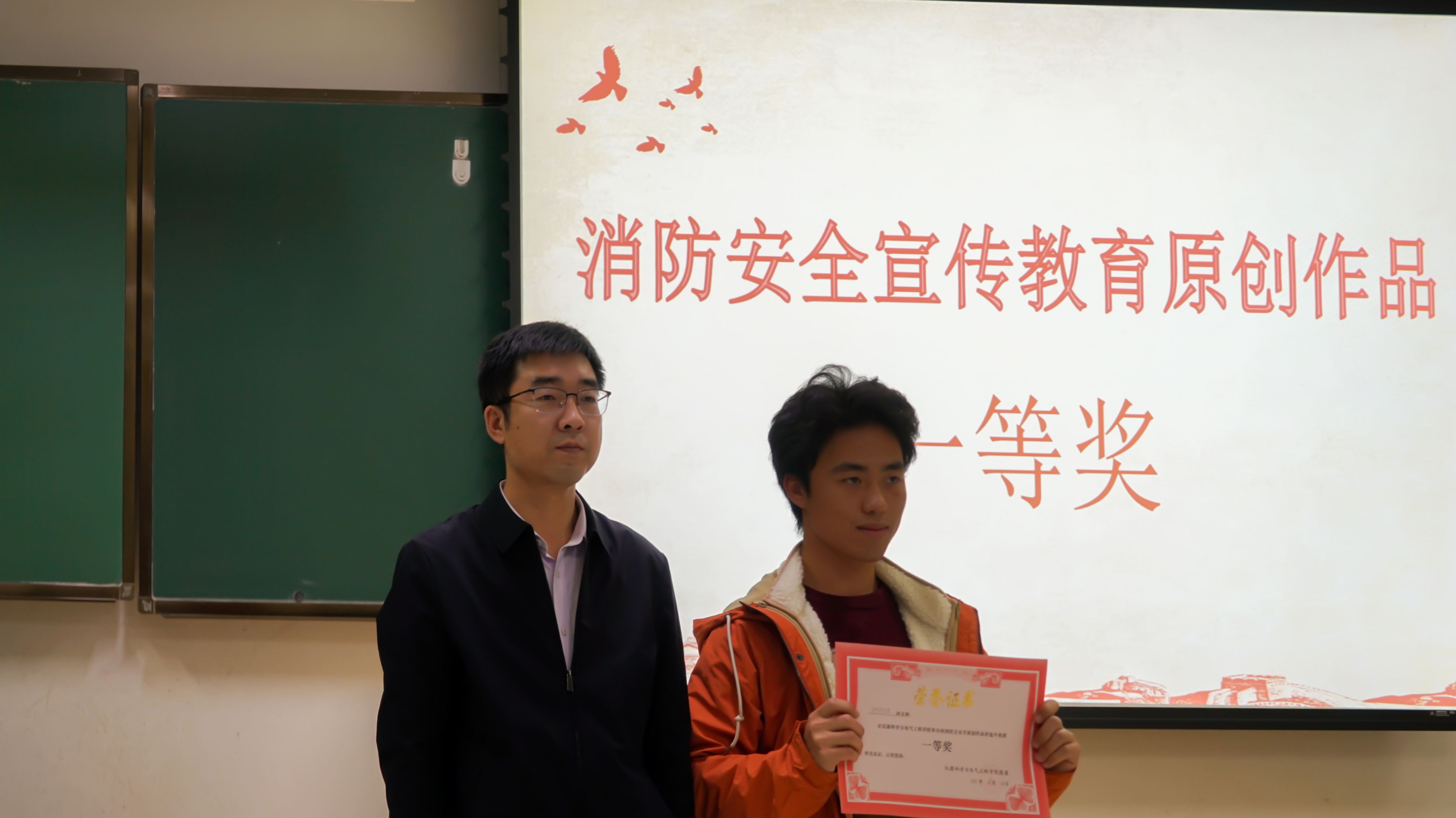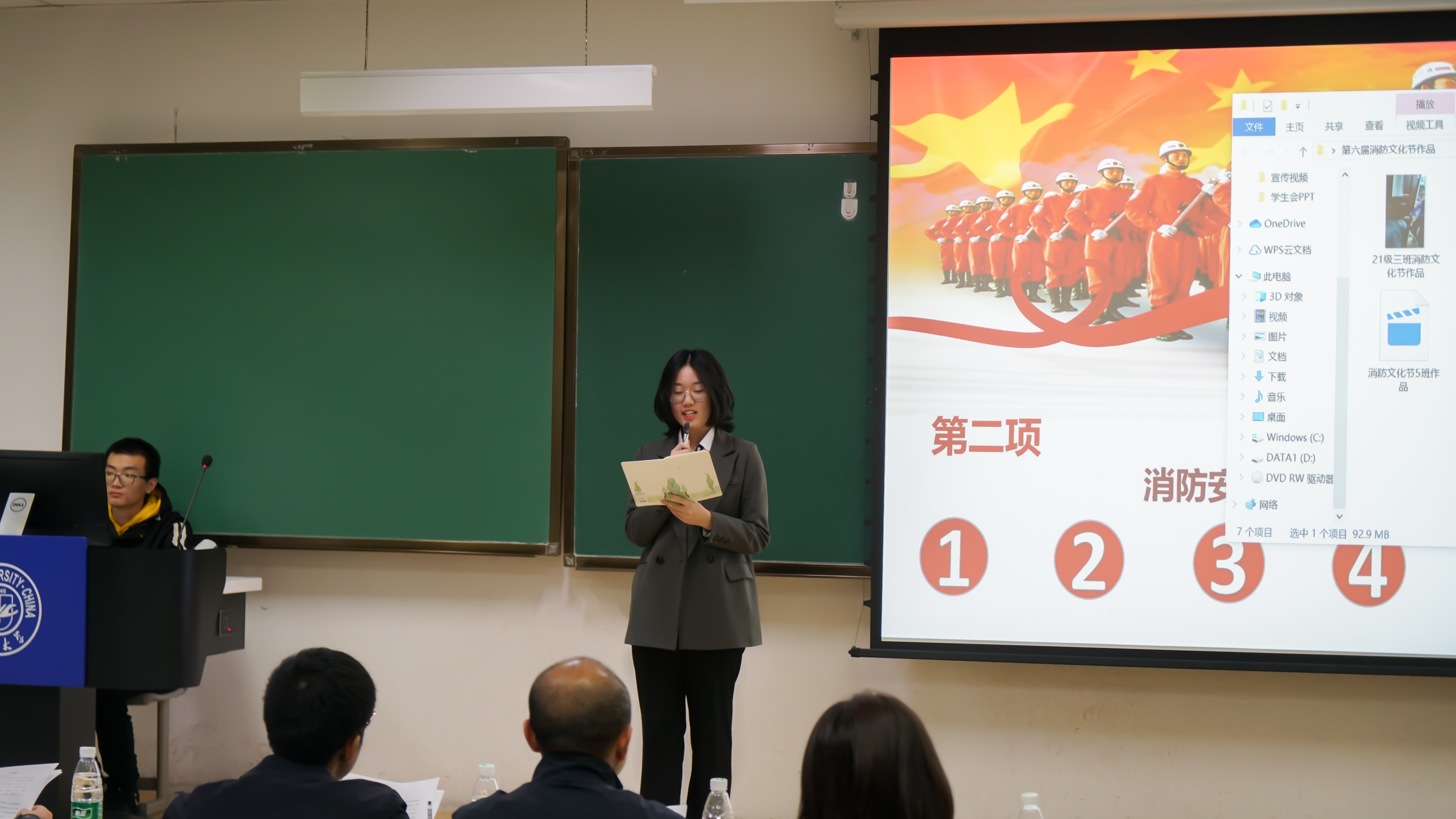 对于消防安全的重视,详细讲解了校园消防安全管理、校园火灾预防、扑救初起火灾、应急疏散演练等消防知识。接下来,21级的同学们依次上台展示消防安全宣传教育作品,作品主题鲜明、方式多样、题材丰富,从各个方面充分地阐述了消防安全的重要性,赢得了现场师生的认可和掌声。作品展示结束后,进入消防安全知识竞答环节,主持人与现场观众互动,同学们举手抢答。在第一轮中,每班的代表们踊跃回答,为班级争光,气氛十分活跃。进入第二轮的抢答个人战后,同学们也积极参与,充分展现个人实力。随后,主持人公布了本次消防文化节作品的评选结果,并由唐小兵老师、边江老师、周伟老师依次为获奖班级颁发证书。最后,周伟老师为本次活动进行总结,高度肯定了活动开展的意义,并就大学生群体与防范火灾之间的关系做出阐述,呼吁我们把消防意识深植我们心里,在日常生活中关注消防安全,共建和谐美好环境。至此,本次消防文化节活动圆满落下帷幕。