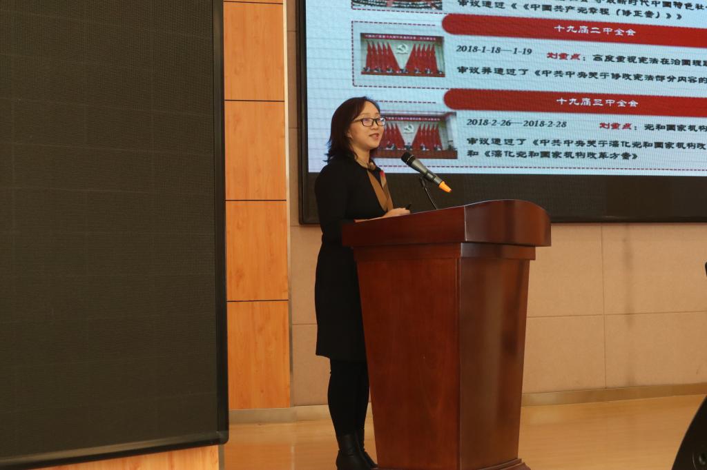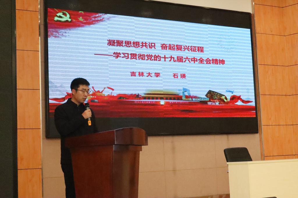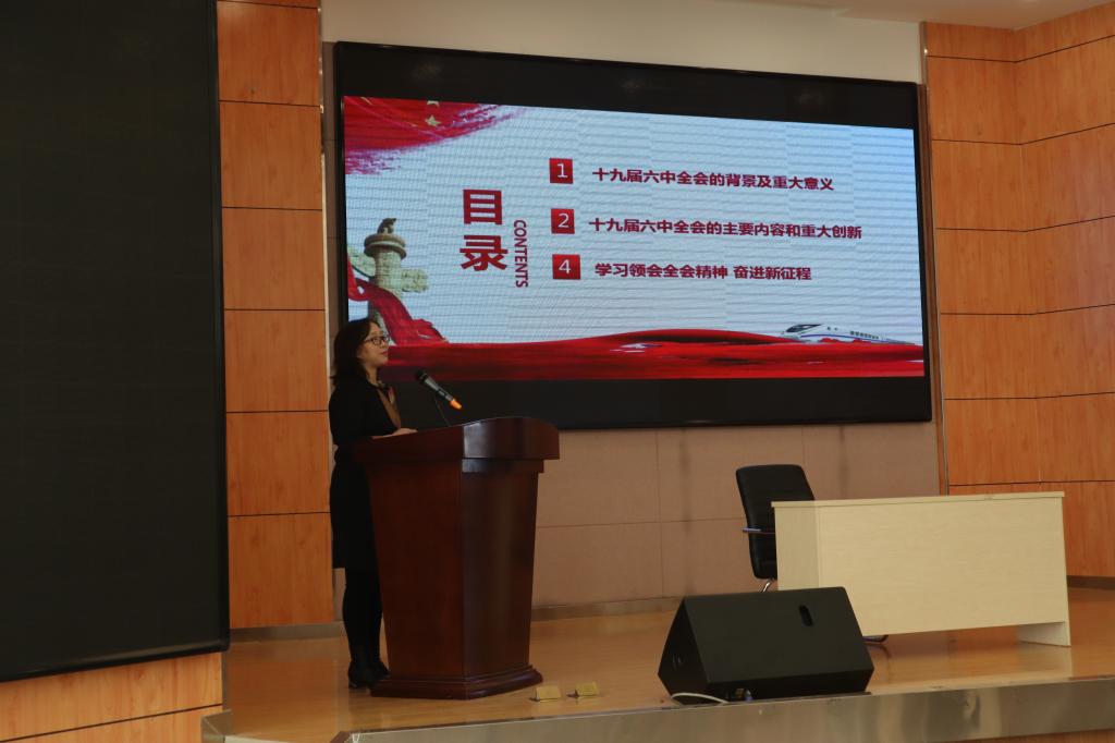 石瑛老师以“凝聚思想共识 奋起复兴征程”为主题,为全体师生详细解读了十九届六中全会召开的背景及重大意义,带领全体师生回顾了历次中央会议的决议。在讲解过程中,石瑛老师讲述了此次决议起草的重要原因与目标,让老师同学们更加深入了解了此次会议。在此之后,石瑛老师重点阐述了十九届六中全会的主要内容和重大创新,回顾了我党的百年奋斗历程,从历史到今天,我党经历了无数风霜雪雨,今天的伟大成就来之不易,阐明了此次十九届六中全会召开的重大意义。最后,石瑛老师号召同学们培养责任与担当意识,秉持中国共产党的根本宗旨,全心全意为人民服务,争做中国发展道路上的先锋梯队,为建设中国特色社会主义道路、实现中华民族伟大复兴的中国梦贡献自己的力量。