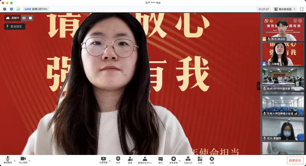 同学的分享,东南大学党团支部学生代表分享他们的抗疫事迹。精彩的发言与分享让与会的同学们再一次感受到了战“疫”之下青年人的奋斗与担当。围绕会议主题,参会同学展开了热烈的讨论,学生代表纷纷表示中国共青团成立100周年是历史性的一刻,青年一辈是时代的见证者,也是时代的参与者,要牢记使命,努力奋斗,回报祖国。