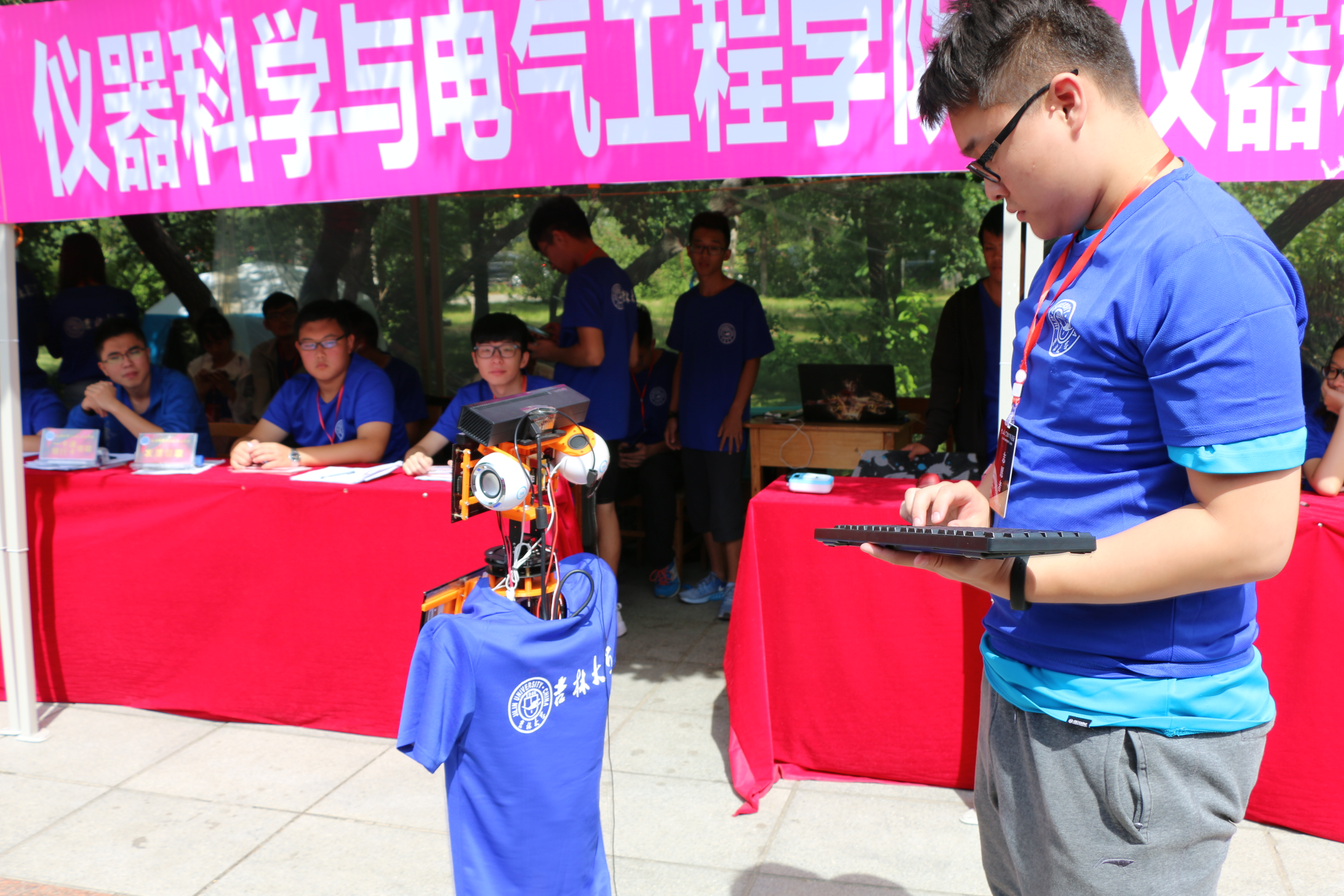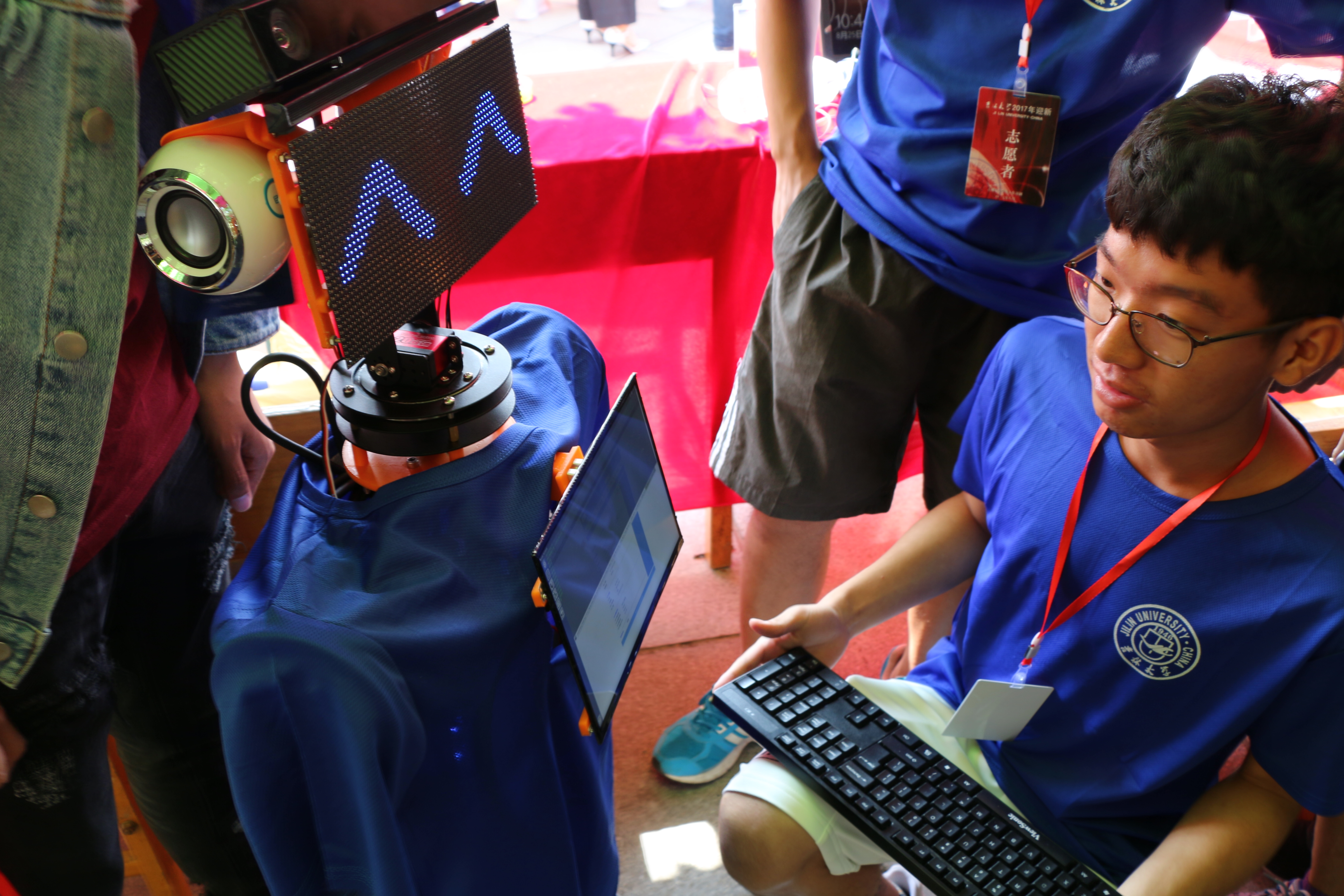 “小七”机器人是仪电学院本科生自主研发设计的,从正面看他是一个穿着蓝色迎新服装的小机器人,具有表情显示器、麦克风、音响、显示屏、驱动轮等硬件设备,可以由蓝牙键盘和手机发出指令远程对其控制。此次迎新工作中,他的出现大大减轻了现场工作的同学们的负担,同时实现了新生报到过程由纸质到电子的转化。负责维护“小七”的同学也为慕名而来参观的领导、老师、记者们解释了小七的迎新工作原理并当场演示他的工作效果。目前,仪电学院的迎新机器人小七已经被《长春晚报》、《腾讯新闻》、《吉林新闻》等多家媒体报道,受到了大家一致的好评。据了解,机器人“小七”是互联网+大赛的参赛设计成果,它旨在缓解孤寡老人独自在家没人照顾而孤独无助的情况,可以与老人进行语音互动,而且具有人体健康状况检测功能,在联网情况下,当检测到老人身体异常时可自动联系医院进行通知,其应用前景十分广泛。