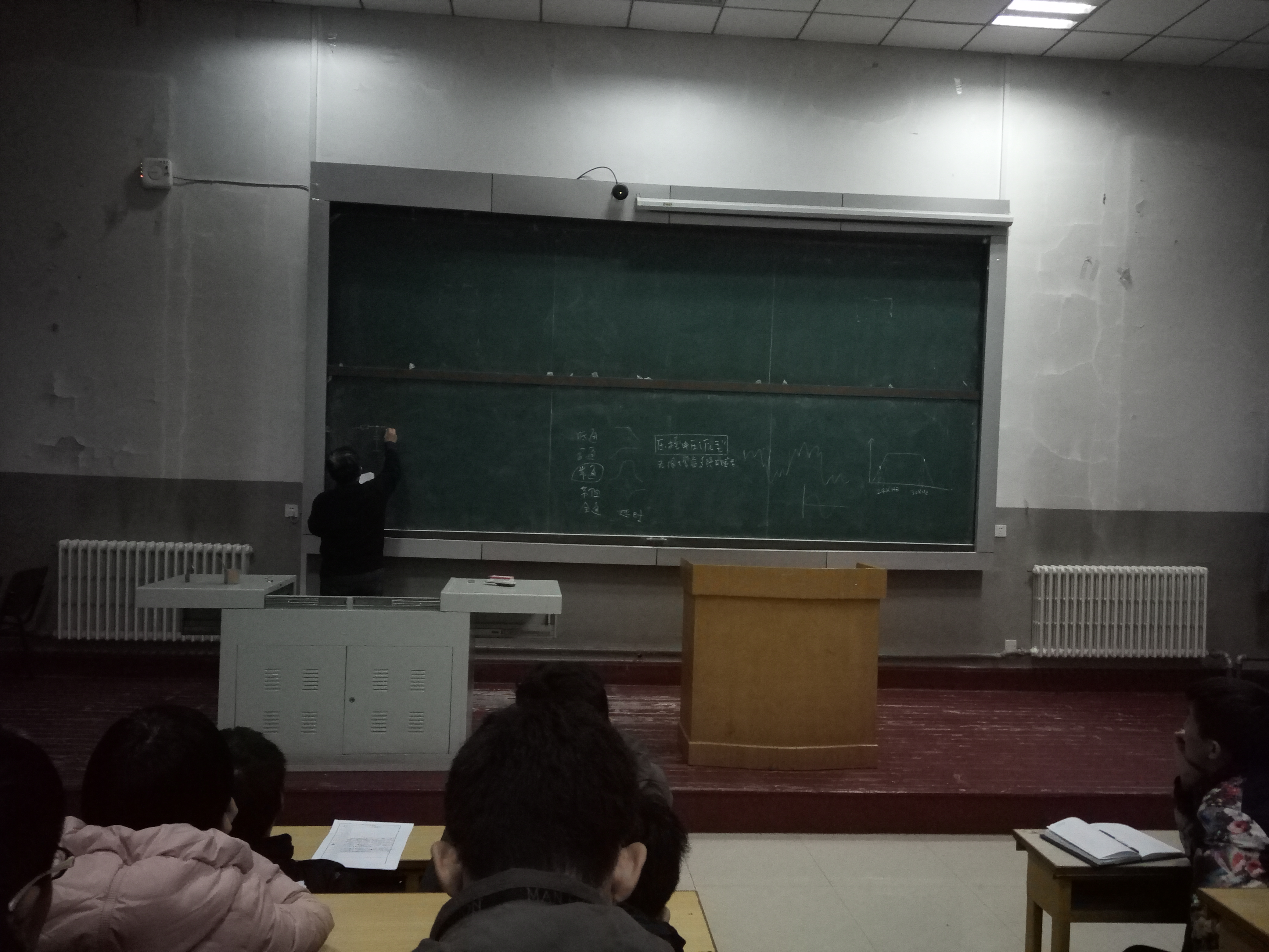 下午3:00-17:00于地质宫224教室,王应吉老师为实验室14、15、16级全体成员讲解了2013年综合测评题的设计方案。王应吉老师首先简单的介绍了滤波器的种类,滤波其种类主要有四种:低通、高通、带通、带阻滤波器。随后,王应吉老师利用带通滤波器的通式,对二阶有源带通滤波器进行了方程求解。在王应吉老师求解的过程中,全体同学都集中精神,跟着王应吉老师的思路一步一步求解下去,在王应吉老师得出方程解的那一刻,全体同学为王应吉老师献上了热烈的掌声。王应吉老师在得出方程解之后,告诉同学们用相同的方法即可求得低通、高通、带阻滤波器的解。最后,王应吉老师询问同学们在实践时遇到的问题,并给出了宝贵的意见。