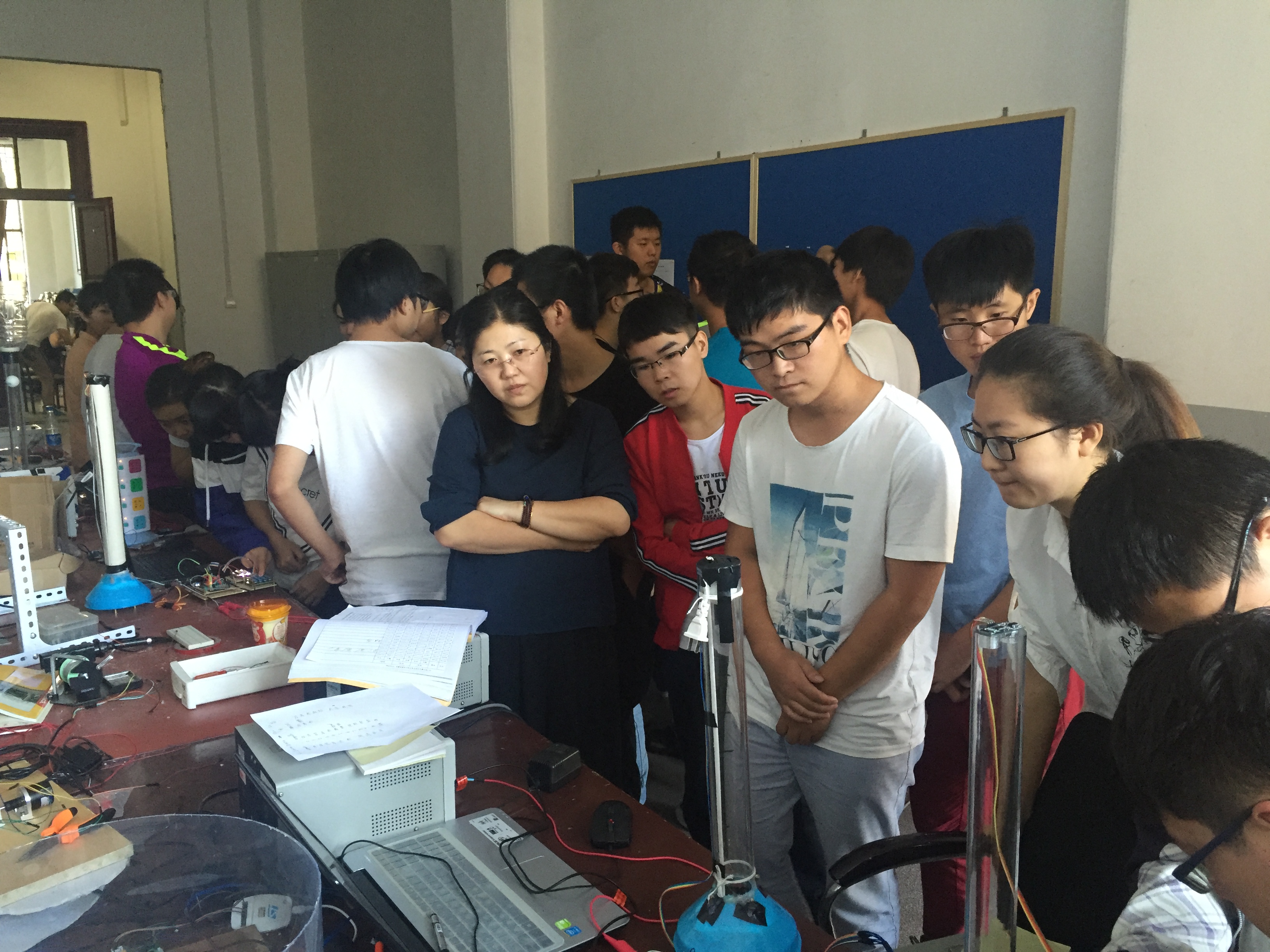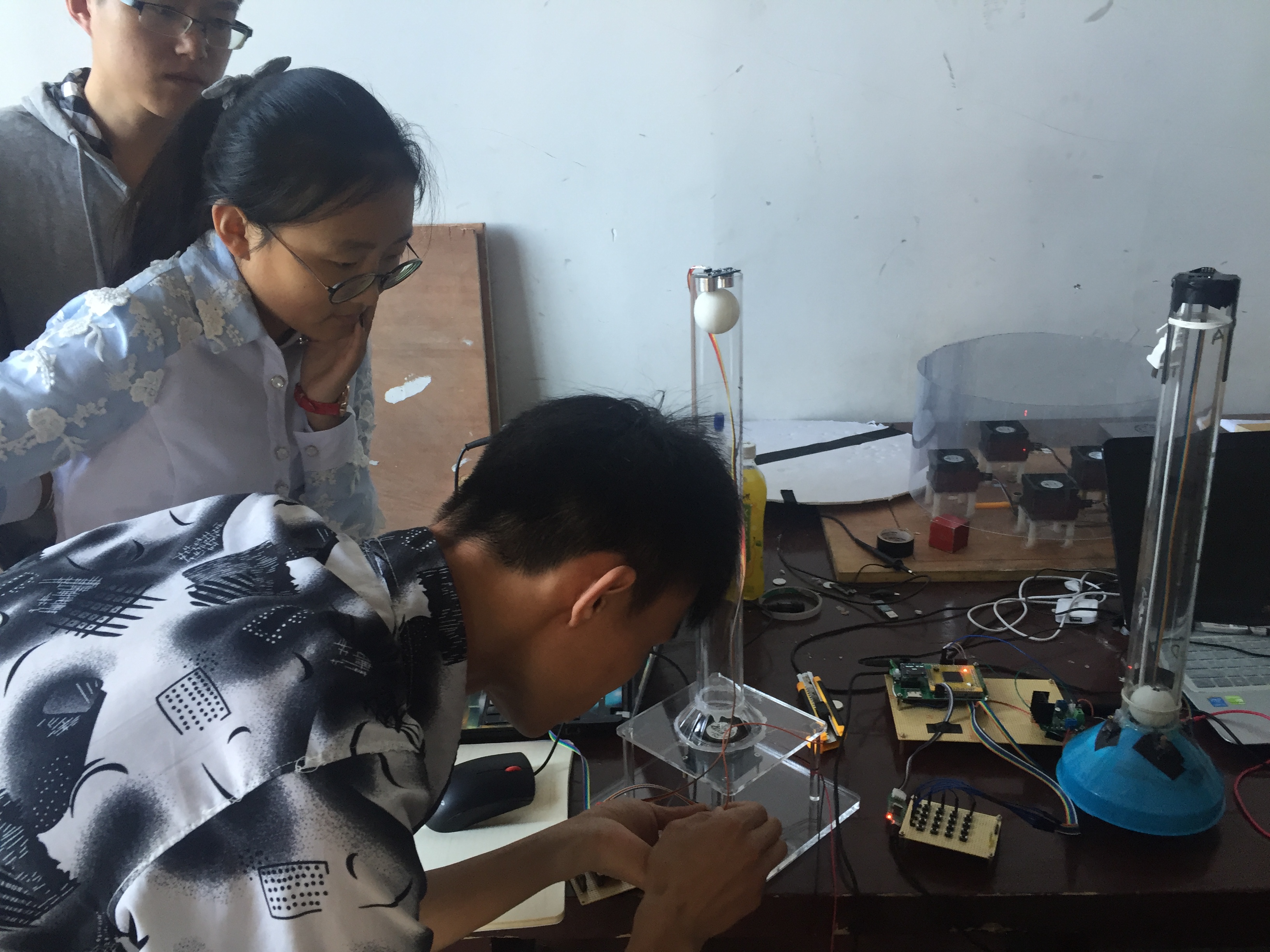 为了能圆满的完成三下乡活动之专业社会实践活动的各项任务,在为期65天的赛前培训期间,同学们充分发挥了仪电学院刻苦拼搏的精神,秉承实验室多年来精益求精的理想,始终奋斗在实验室。当中,大一新生杨洋的努力格外引人注目。作为卓越工程师班的学生,不仅追求学业成绩优秀,而且励志在实践方面也同样做到巾帼不让须眉。由于平时缺乏实践方面的培训,面对困难的她并没有气馁,反而增加了自己在实验室的时间,她用比别人多花的时间将实践方面的缺陷慢慢地补了回来。“人十能之,己百之”,正是凭借着这种精神,杨洋同学交出了一份令人满意的答卷。14级控制组为了能顺利的控制好乒乓球的悬浮,不仅自学3D打印机的使用,而且学会了利用刻板机刻制电路板,他们在目标的驱动下、老师和学长的帮助下不断地进步、不断地充实自己。此外,作为主力的13级学生也有条不紊地进行工作,不少学生为了能挤出更多的时间不惜在实验室打地铺睡觉。期间,为了检测大家在培训期间的成果,千承辉老师举行并主持了中期检查,所有学生的作品都受到了严格的审查和仔细的点评,检查过程中同学们相互交流,氛围良好。
