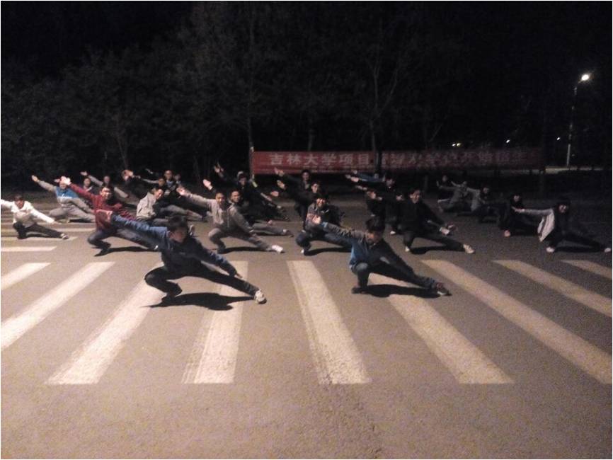 三路长拳的训练在每天20:30拉开序幕。首先,由2013级参加上届运动会三路长拳比赛的学长向队员们讲述动作要领,并亲身示范细节上需要注意的方面。随后,在学长的带领下,全体三路长拳团队队员整齐划一地列好方阵,每晚都认真进行多达十余次的整套动作的演练。在紧凑有力的伴奏声中,每一位队友都热情满满,即使有几天由于天气原因不能在室外训练,队员们也没有松懈,把训练场又室外转向了室内。辅导员老师也来到训练场地,对大家的辛勤训练给予高度的赞扬。大家力求把每一个动作做到精准、到位,虽然训练量较大,训练时间较紧,但没有一个队员喊苦叫累,团队凝聚力得到了充分的彰显。每次训练历时两个多小时,最终都是在团队间相互分享动作心得的交流沟通中落下帷幕。