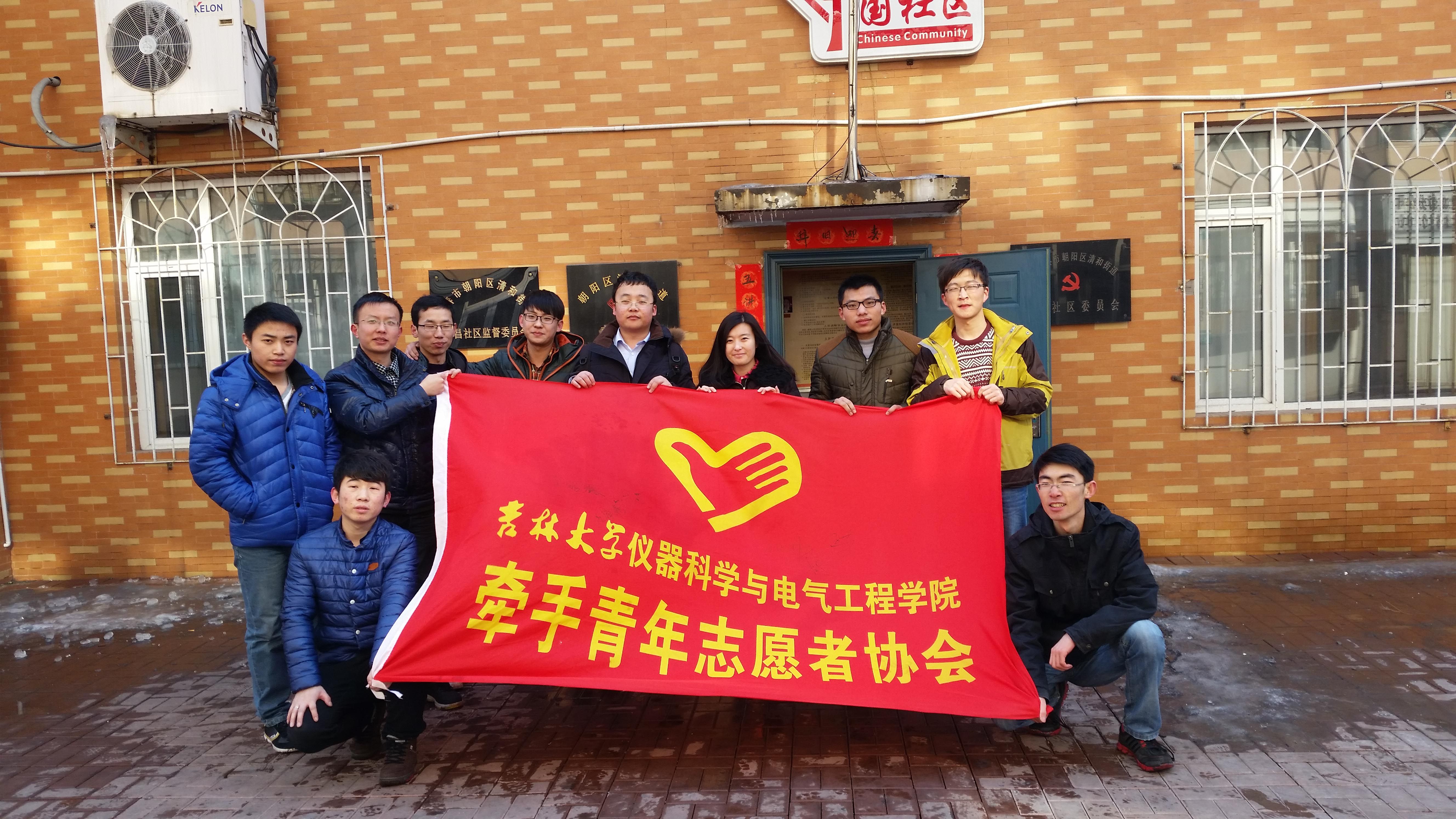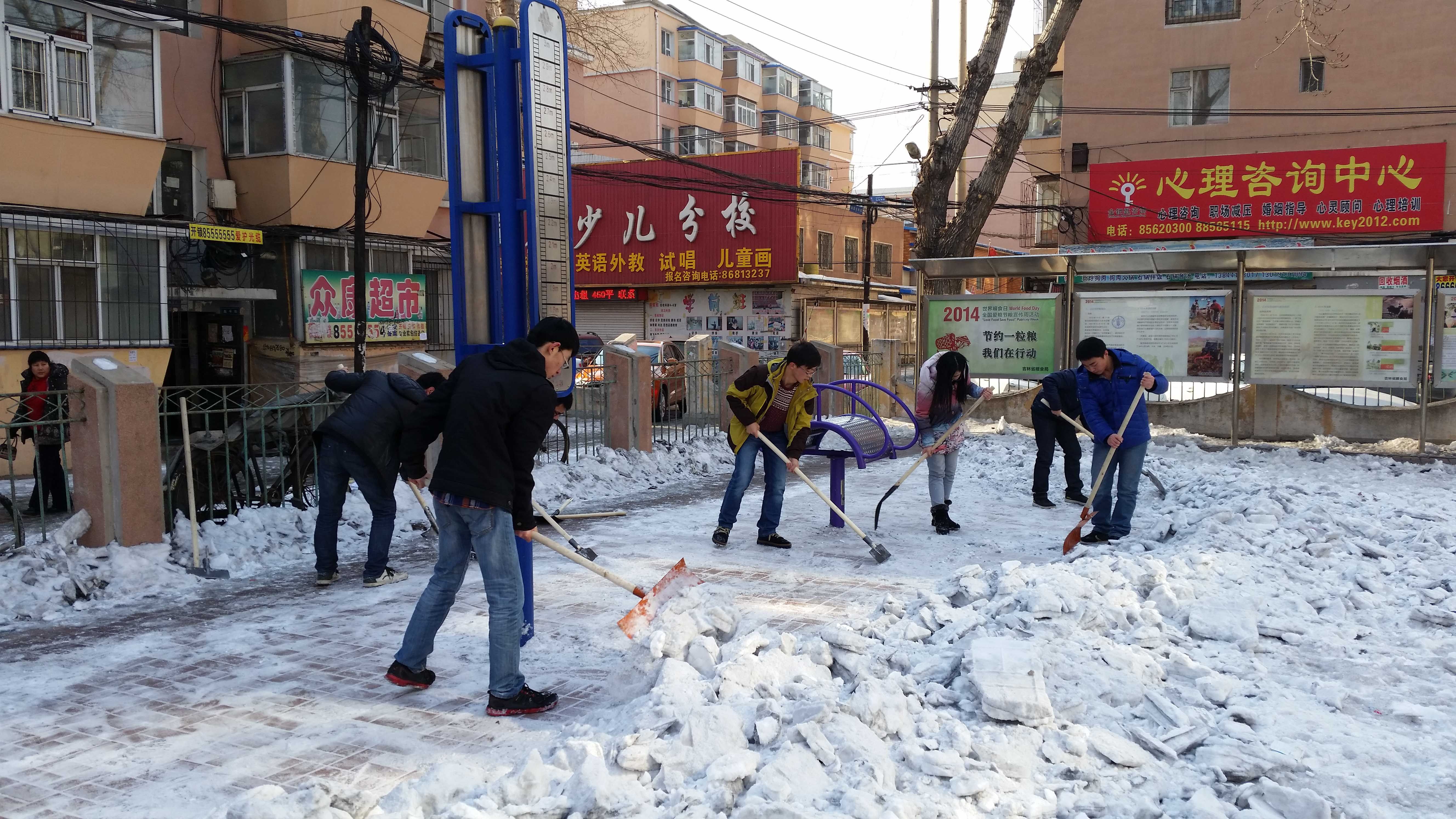 团委“牵手”青年志愿者协会志愿者在指导教师张昊宇的带领下走进朝阳区清和街道南昌社区开展义务除雪除冰活动。
