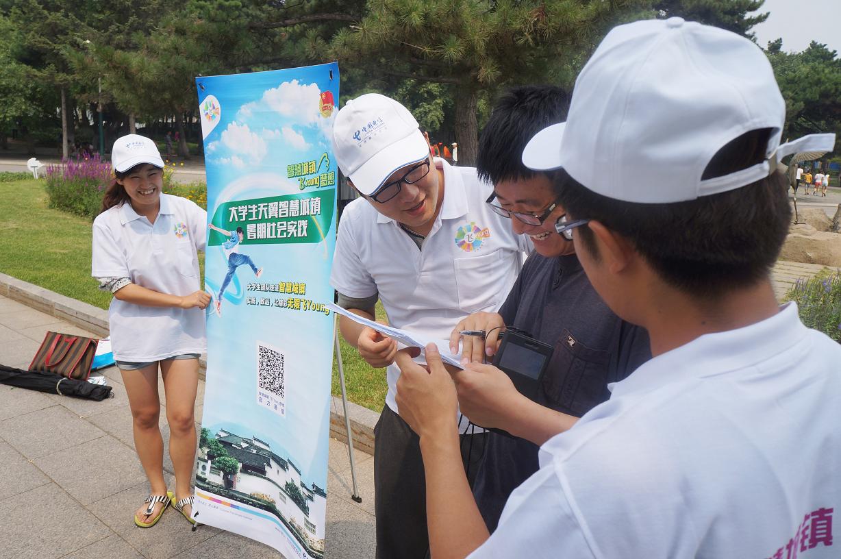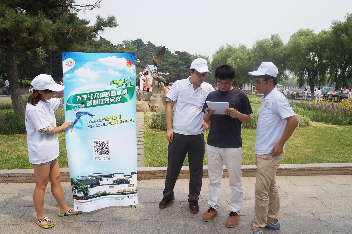 团委认真组织、精心部署,组织成立了“东北情•振兴梦”大学生科技调研实践团,被学校推荐为2014年暑期“三下乡”社会实践活动全国重点团队(“天翼”智慧城镇调研计划,全国共计100个团队)。8月8日,实践团主要成员走进长春市南湖公园开展了“智慧城镇,飞Young梦想”信息化专项调研活动。