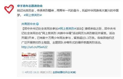 团委、“牵手”青年志愿者协会开展了“微博祭英烈 共铸中华魂”活动,活动通过QQ微博平台进行宣传推广,受到了青年学子的广泛关注,并产生了良好的宣传效果。