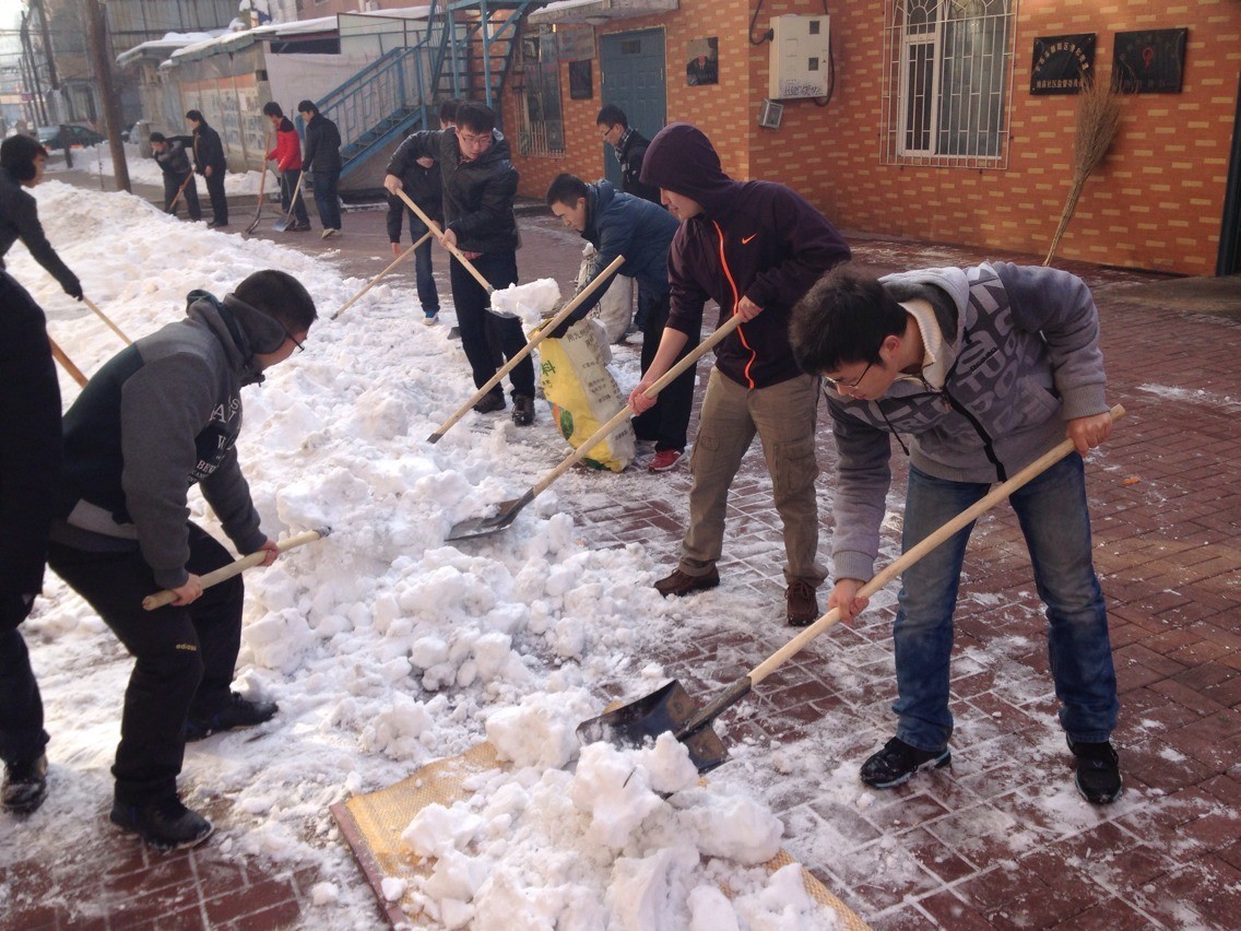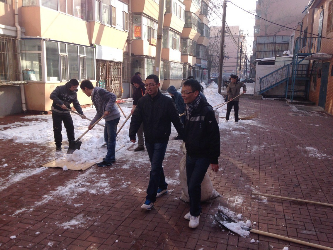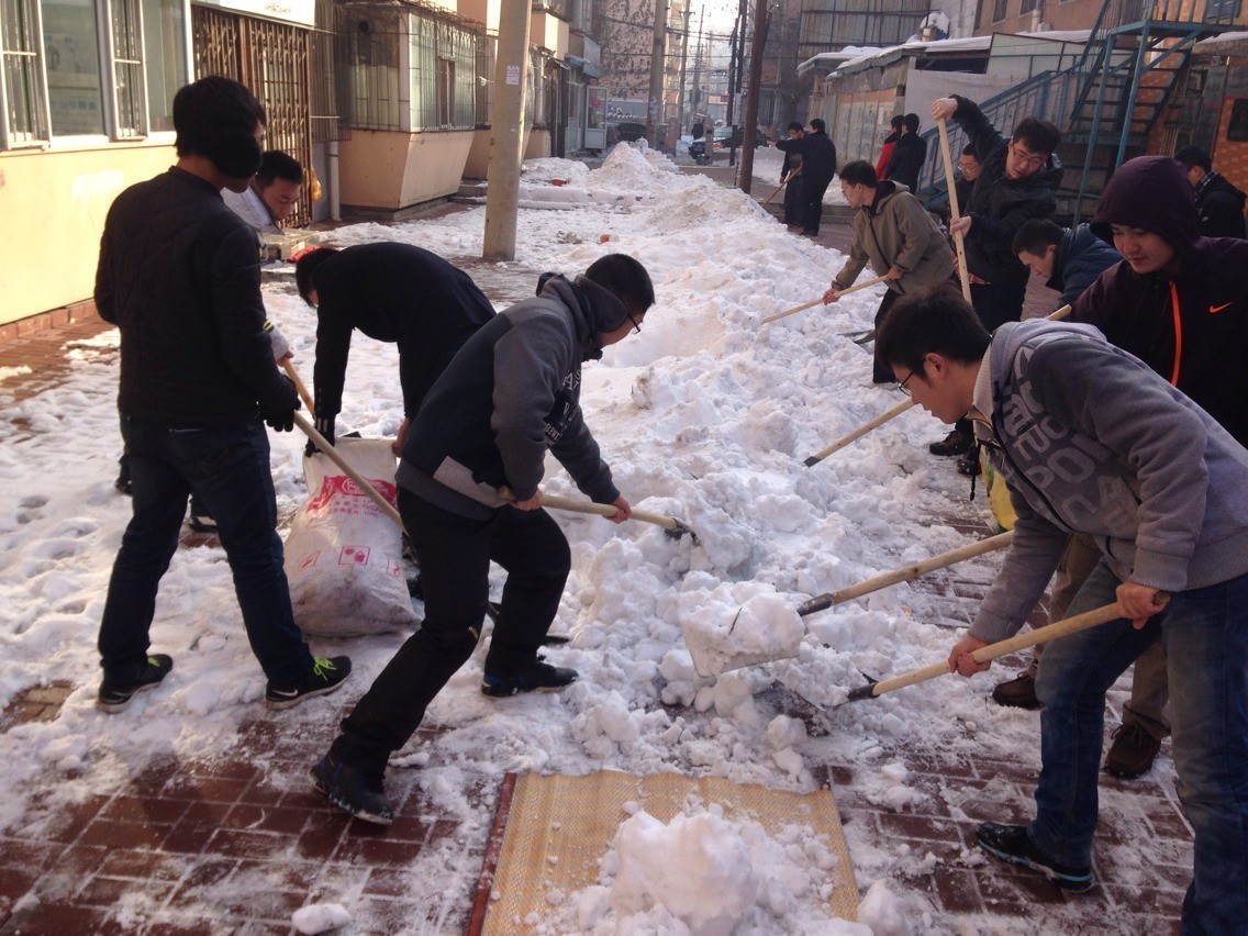 团委迅速行动,于2013年11月24日组织60余名大学生走进朝阳区清和街道南昌社区开展了爱心义务扫雪活动,保障了社区交通顺畅,保证了居民出行安全。