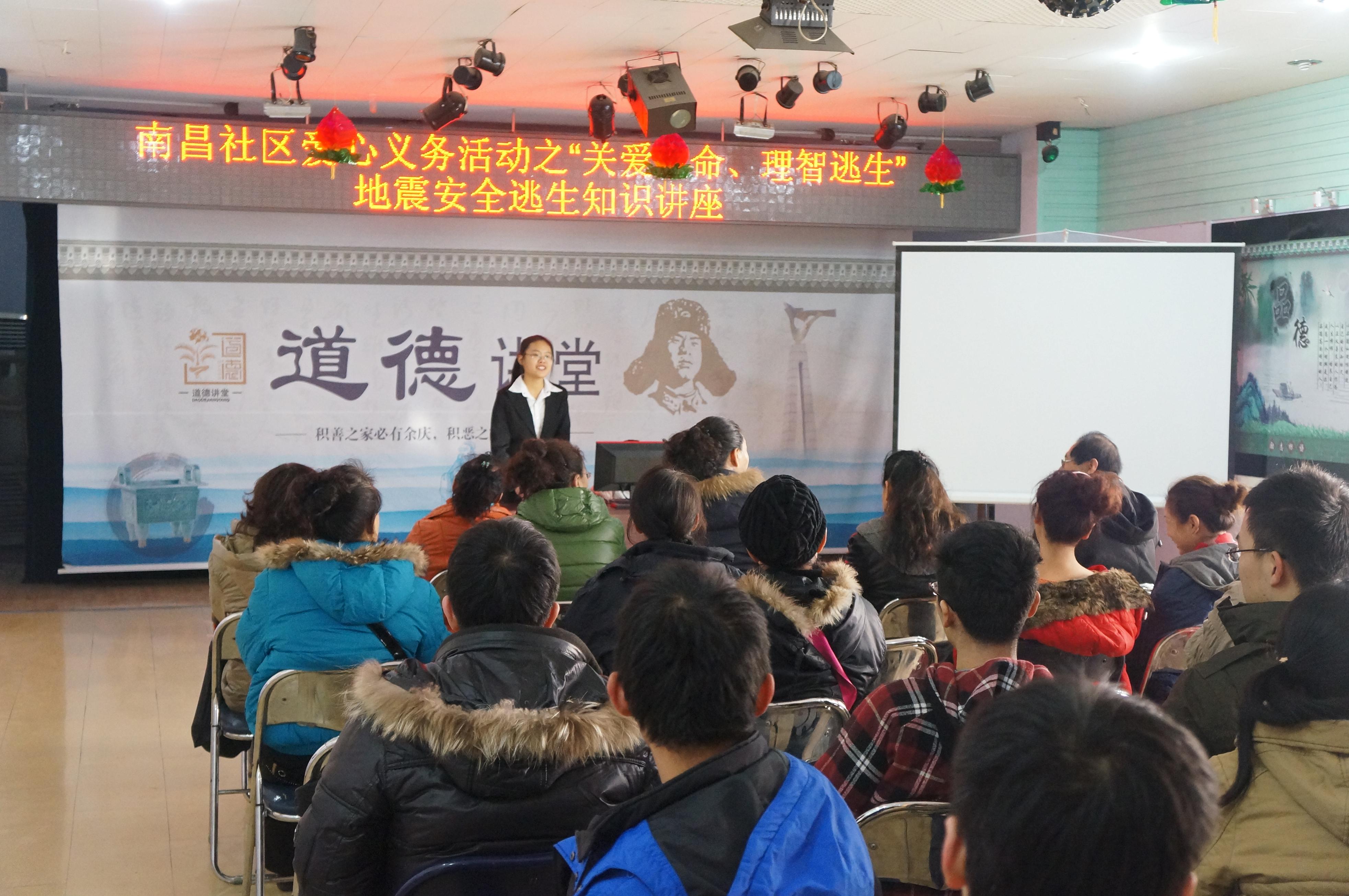 团委于2013年12月4日组织40余名大学生志愿者走进朝阳区清和街道南昌社区开展了以“关爱生命、理智逃生”为主题的地震科普知识讲座。