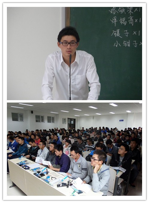 此次培训会由科技协会原会长、2013级硕士研究生周贺同学主讲,他主要为同学们讲解常用电子元器件的识别和散件焊接的技巧。培训会正式开始前,协会工作人员为2013级新会员发放了内部编写教材及实验器材,同学们拿到器材后纷纷展现出了极大的兴趣与热情。随后,周贺同学阐述了实践对于本专业的重要性,并介绍了本学期培训活动日程安排。接着,周鹤同学为大家讲解了电路电工实验的一些电阻器、电容器等常用电子元器件的识别及电路焊接工具的使用,并讲解了一些实际实验操作中可能会遇到的问题及解决方法。最后,他说明了本学期培训活动所要完成的实验作品及考核方式,并表达了对2013级会员们的期望。