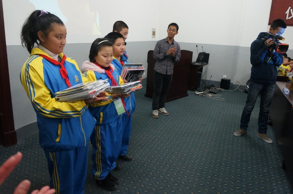 的志愿者们将在“爱心传递书香”活动中为孩子们募集到的爱心书籍捐献给了学生代表,这些书满满地承载着 onlytik