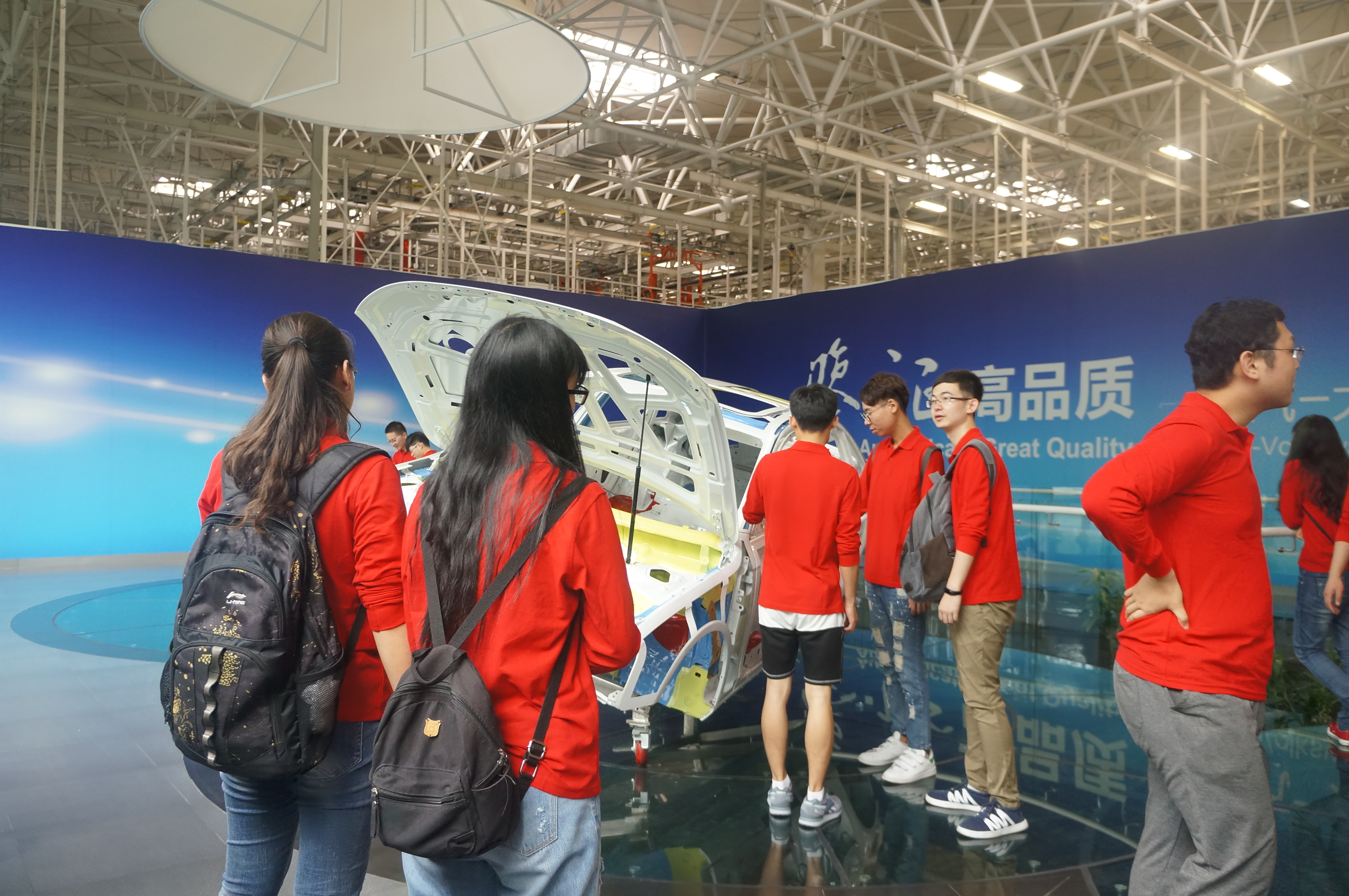 一汽前身是第一汽车制造厂,由毛泽东主席题写厂名。1956 年建成并投产,曾制造出新中国第一辆解放牌卡车。1958 年制造出新中国第一辆东风牌小轿车和第一辆红旗牌高级轿车。一汽的建成,开创了中国汽车工业新的历史。经过五十多年的发展,一汽已经成为国内最大的汽车企业集团之一。 截至 2009年10 月,中国 1000万 辆自主轿车在长春下线,中国成为名副其实的汽车强国。实践团成员在一汽门口在短暂的拍照留念之后便进入了生产车间,坐上了参观车后,开始了参观之旅。车间十分大,内部灯光明亮,循环系统也很好,据介绍,这里的通风系统每小时会抽一百立方米的新鲜空气进入车间。实践团成员首先参观了安装挡风玻璃的部分,挡风玻璃先由机械手从特定位置传输过来,工人便会将玻璃安装在车上,完成自己工作的部分。接下来成员们依次参观了三合一加注、保险杠的安装、车门的安装等一系列内容。其全部工作均为流水线作业,采用自动化生产线能提高劳动生产率,稳定和提高产品质量,改善劳动条件,缩减生产占地面积,降低生产成本,缩短生产周期,保证生产均衡性,有显著的经济效益。自动化生产线还可以将人从繁重的体力劳动以及恶劣、危险的工作环境中解放出来。