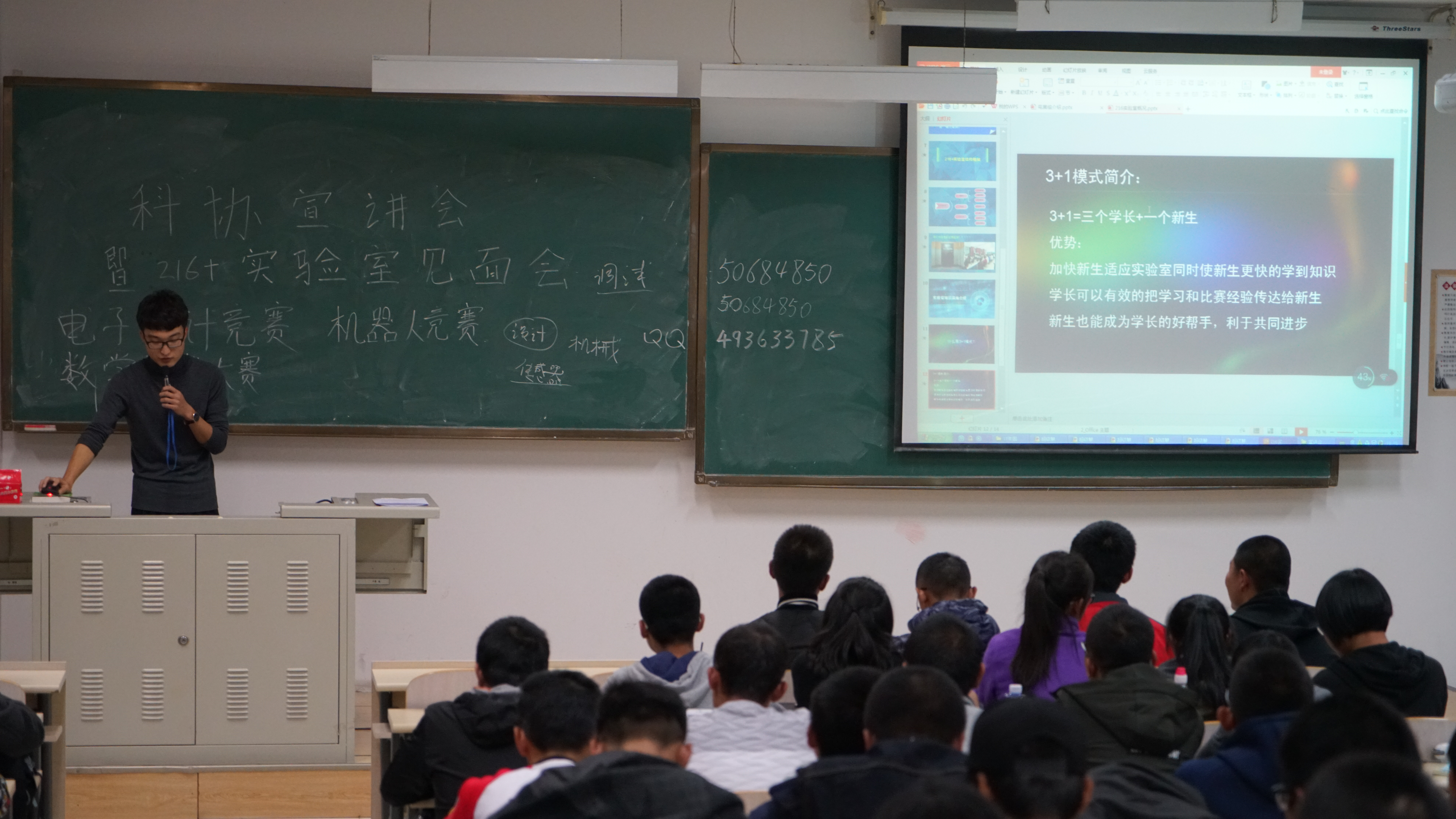 大学生科技创新协会进行了简介,呼吁大家在搞好学业的同时积极参加科协的培训,从培训中提高自己的动手能力,提高自己的科技创新能力,争取在各类竞赛以及科技创新中取得更大的成果。随后实验室负责人陈浩介绍了216+实验室概况并现场讲解了“3+1”模式,实验室各项目负责人也对各自负责的项目进行了简要介绍。最后216+实验室的每个小组通过精美的PPT介绍自己的小组概况以及个人心得,同时分享了他们获得的成就以及成就背后的辛酸与快乐。活动期间,现场掌声激烈,求知氛围浓厚。此次活动不仅解答了2017级新生对科协及216+实验室的困惑,使他们学习了 onlytik