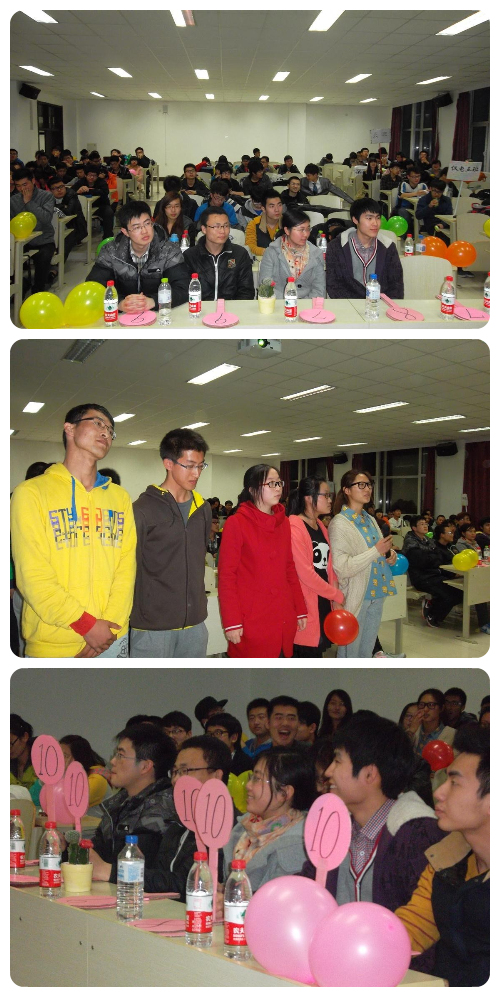 整个活动分为三个环节:第一环节为“秀出我自己”,各班代表分别进行了以“我的梦想”为主题的PPT才艺展示,并由评委打分;从他们精彩的表演中看到的是青春的梦想和奋斗的激情。第二环节为“我爱记歌词”。各班同学踊跃参加,在激烈的竞争中,同学们都表现的从容不迫,力争夺冠,将现场气氛推向高潮。最后一环节为“我爱配电影”,由主持人现场播放一部电影片段,各个参赛班级进行抢答配音。活动最后,由评委根据各位同学在各个环节的表现,给出评分,由学生会联络部部长马晶、学生会副主席王洪超和学生会常务副主席任广安分别为获奖班级颁奖并合影留念。