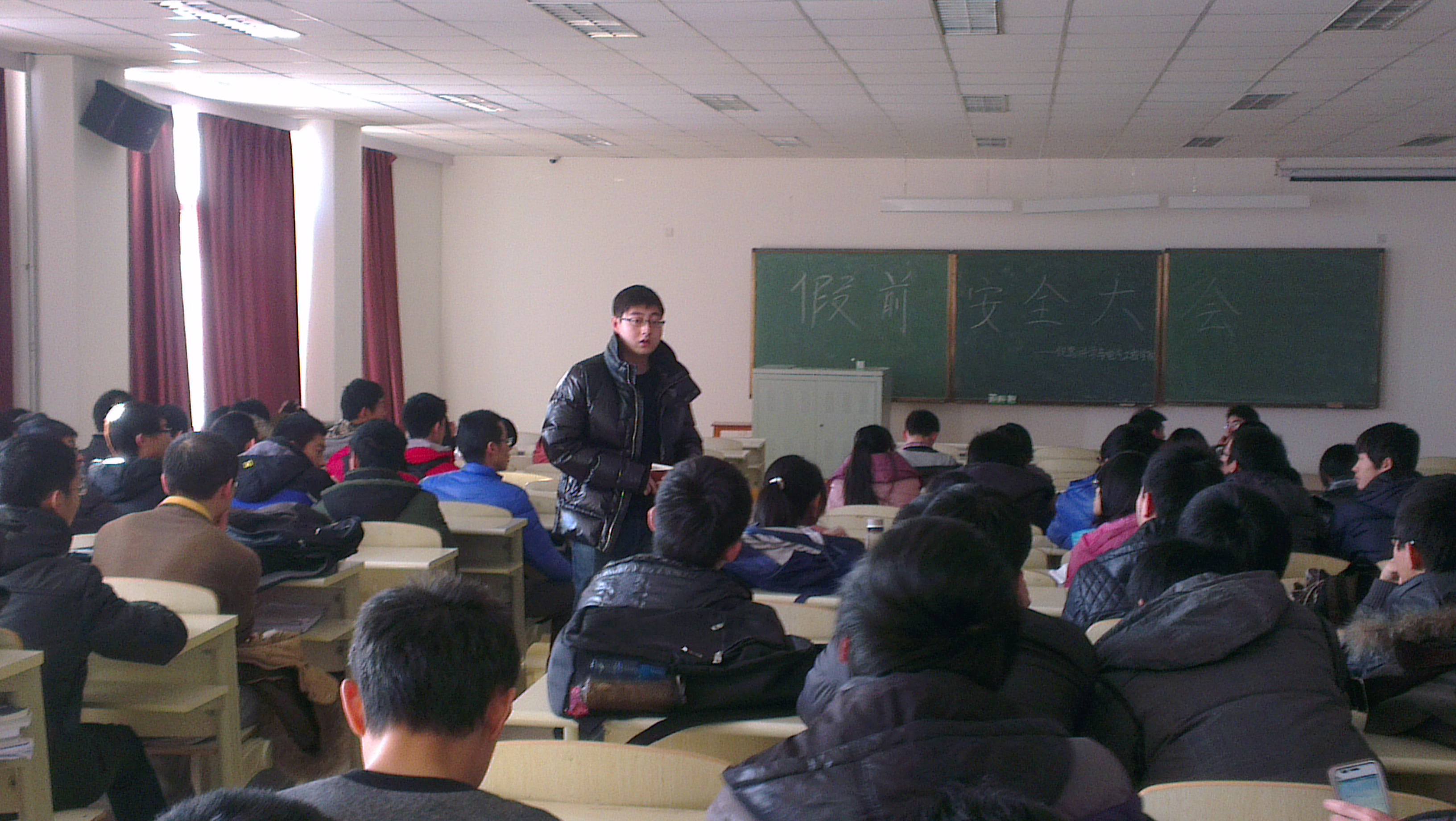 于李四光楼302室召开了期末考前动员暨寒假假前安全教育大会。2012级辅导员蔡印老师出席了本次大会,仪电学院2012级全体同学参加了本次大会。