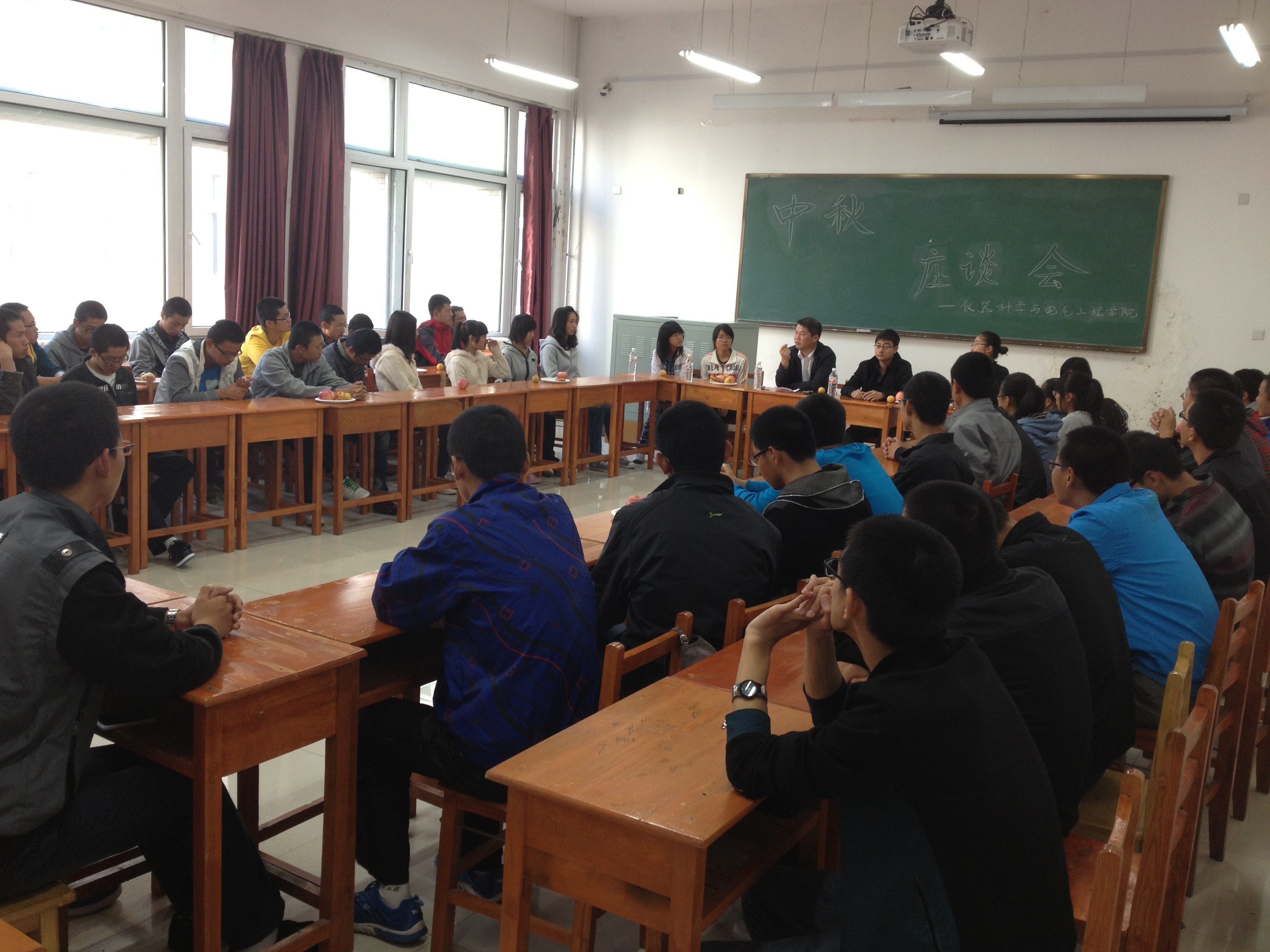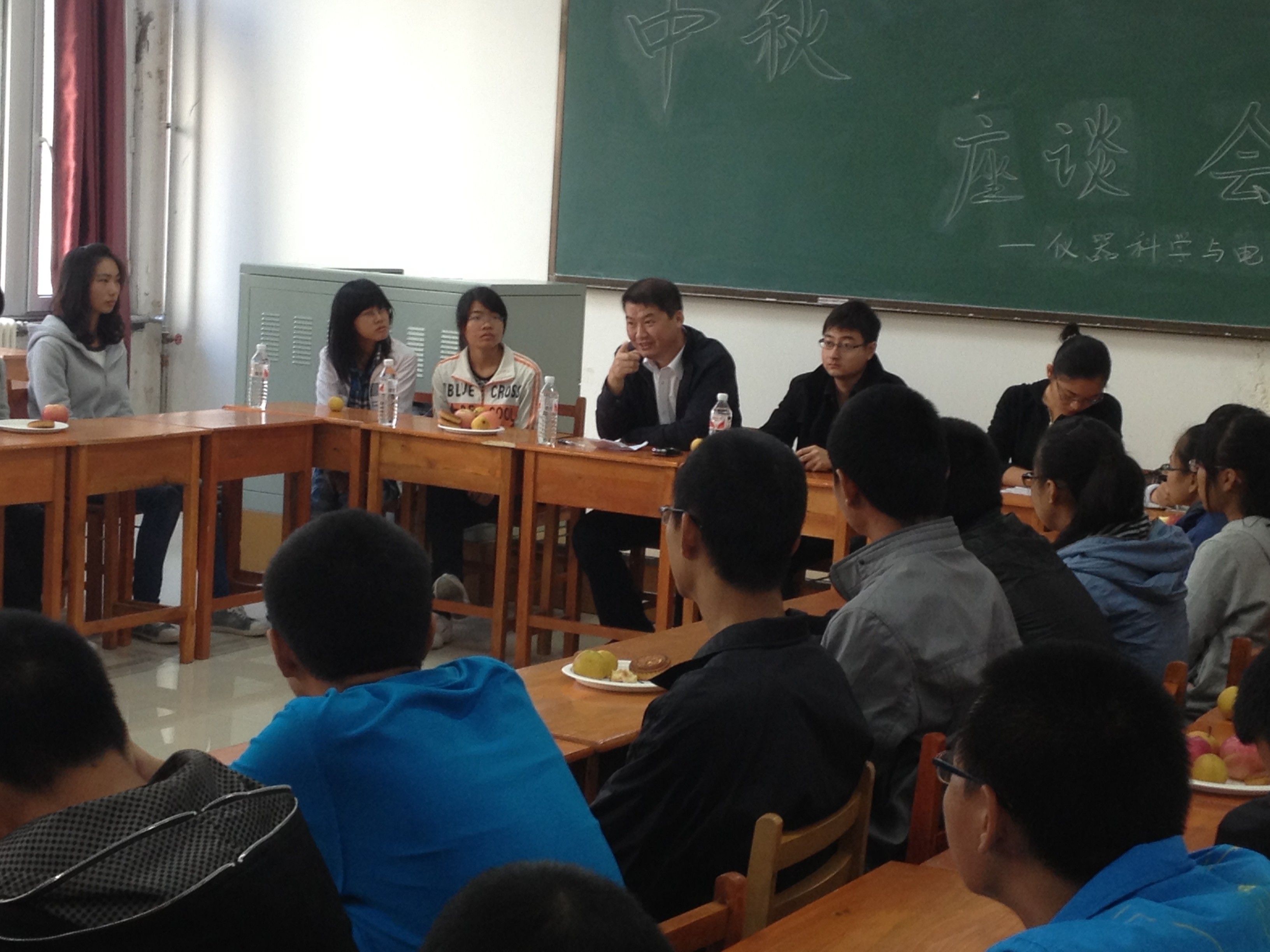上午8点半座谈会正式开始,当邱书记入场时,全体同学起立,用热烈的掌声欢迎邱书记,并齐声献上了节日的祝福。领导入座后,由每位同学进行自我介绍。同学们有的说说自己假期的安排,有的分享曾经与家人如何度过佳节……大家畅所欲言,就像舒心地唠着家常,气氛活跃,其乐融融。接下来邱书记进行了讲话。邱书记首先代表学院领导送来了对同学们及其家人最诚挚的节日祝福。之后,邱书记给所有经济关注对象同学提出了两点要求:第一,告诫同学们不要畏惧困难。邱书记表示,学院一定会尽力为经济困难的学生们解决学习生活中的各方面问题,提供舒适的学习和生活环境。第二,勉励同学们努力学习。越是生活艰苦,越要倍加努力学习,用知识改变命运,用双手创造未来。同时邱书记也送给各位新生同学一句名言:“中年之前不害怕,中年之后不后悔”,以此来鼓励同学们,一定要对未来抱有信心,努力学习。邱书记一番语重心长的讲话,让同学们感觉到家一般的温暖,更让大家坚定了对未来的信心。座谈期间,邱书记和蔡老师还就学生关心的有关学习、生活方面的一些问题做了耐心、细致的解答。会议尾声之际,学生们踊跃展示各自的才艺,美妙的歌声、欢快的舞蹈,赢得全场掌声阵阵。在这中秋佳节之际,在这欢快的气氛中,同学们心中感受到了别样的温暖。最后,由蔡老师总结了这次会议。蔡老师对邱书记的慰问和精彩的讲话致以谢意,并表达了对同学们深深的节日祝福以及对大家未来极大的期望。