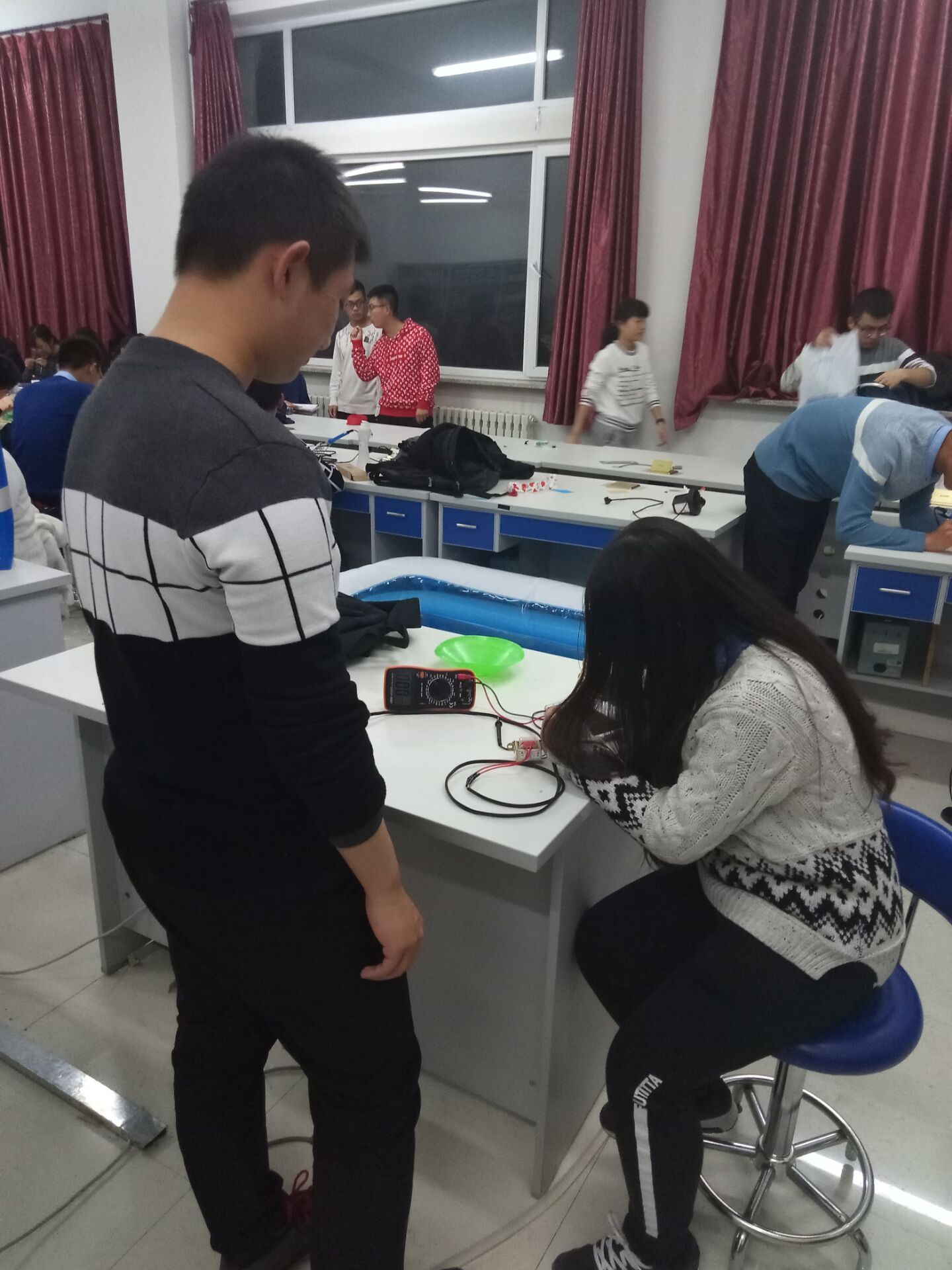 此次培训的内容为红外报警灯电路的焊接以及对上一次培训中电源焊接的检测验收。在培训过程中,2016级相关负责人没有过多的统一讲解,而是针对同学在实践过程中出现的问题进行答疑解惑。培训期间首先2017级新生用色环电阻法识别电阻阻值,找到此次培训所需要的电阻,然后根据负责人给出的电路图和芯片引脚分布图设计自己的电路板。2016级相关负责人走到新生们中间,及时回答问题,新生间也互相探讨知识,学习气氛高涨。最后2017级新生完成电路焊接后,交由2016级相关负责人进行验收,并为他们指出电路中的错误及走锡、布局等问题。当最后报警灯实现闪烁功能并通过验收时,新生们露出了开心的笑容。亲自动手实践极大地激发了新生们的学习热情,也使新生对理论与实践的结合有了更多更丰富的想法。